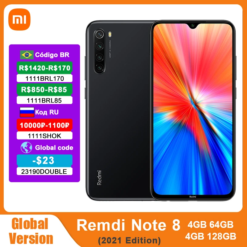 Xiaomi Redmi Note 8 (глобальная версия), 4 Гб 64 Гб2021 ГБ, 128 дюйма, Восьмиядерный процессор Helio G85, мобильный телефон дюйма, четырехъядерная задняя камера 48 МП, 6,3 мАч