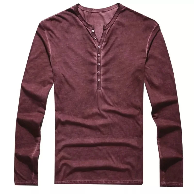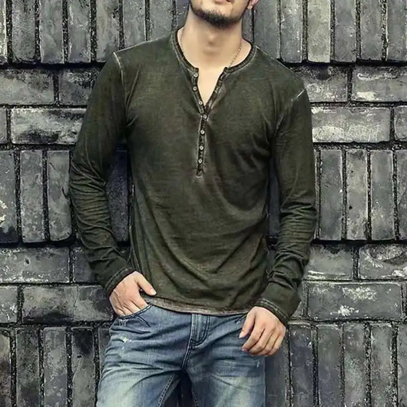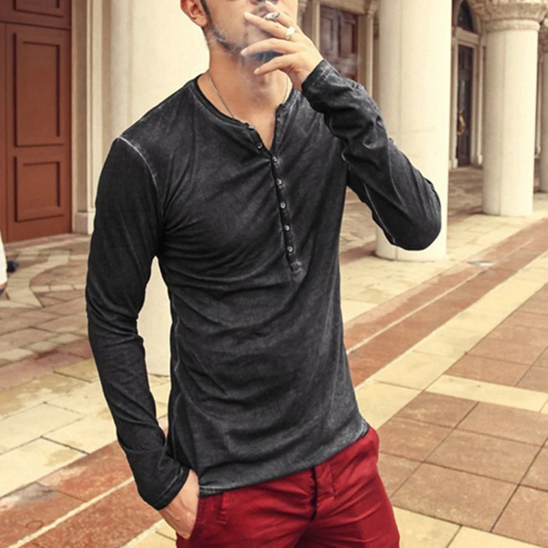 Мужская футболка с V-образным вырезом, длинным рукавом и пуговицами