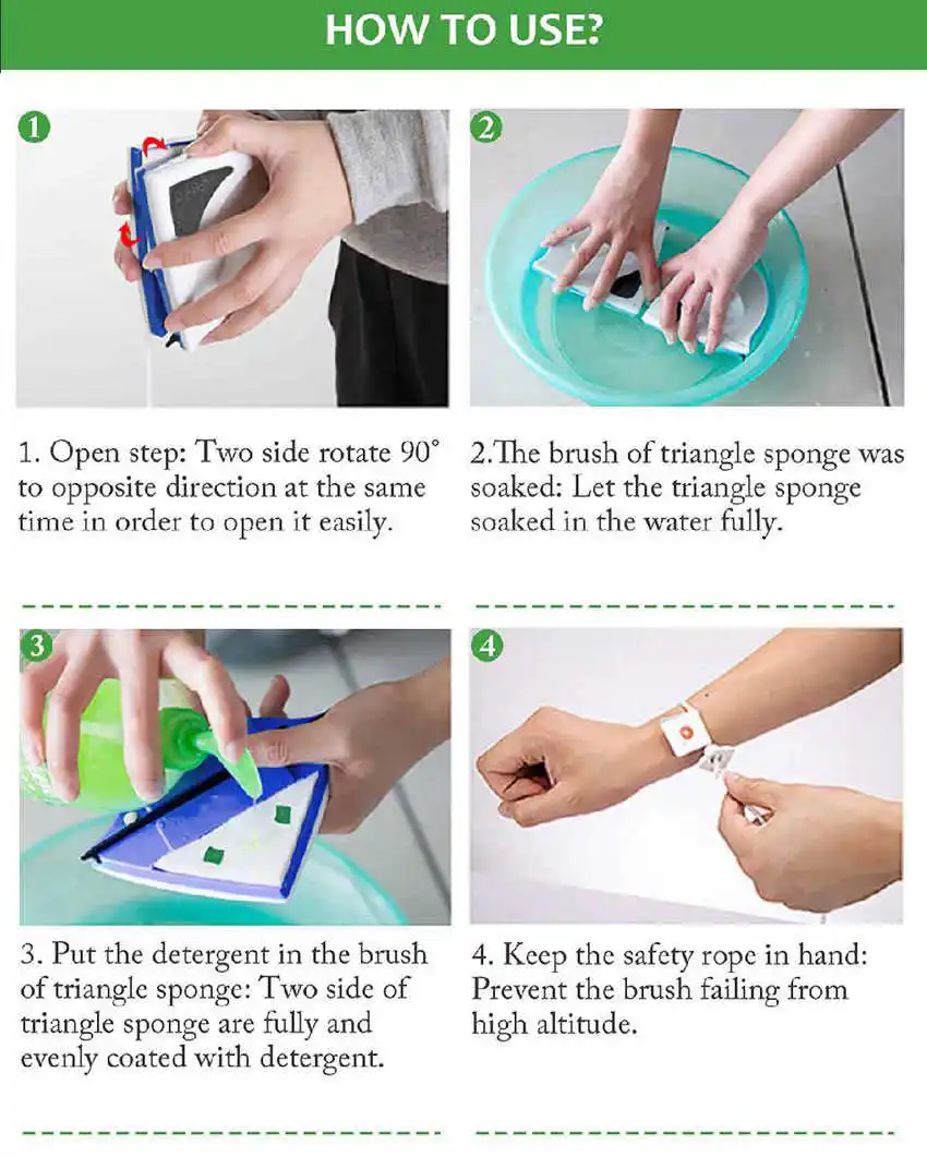 Нанесите моющее средство на очищающий хлопок, иначе скребок трудно перемещать. Медленно перемещайте очиститель магнитного окна во время использования, чем медленнее скорость движения, тем лучше эффект очистки.