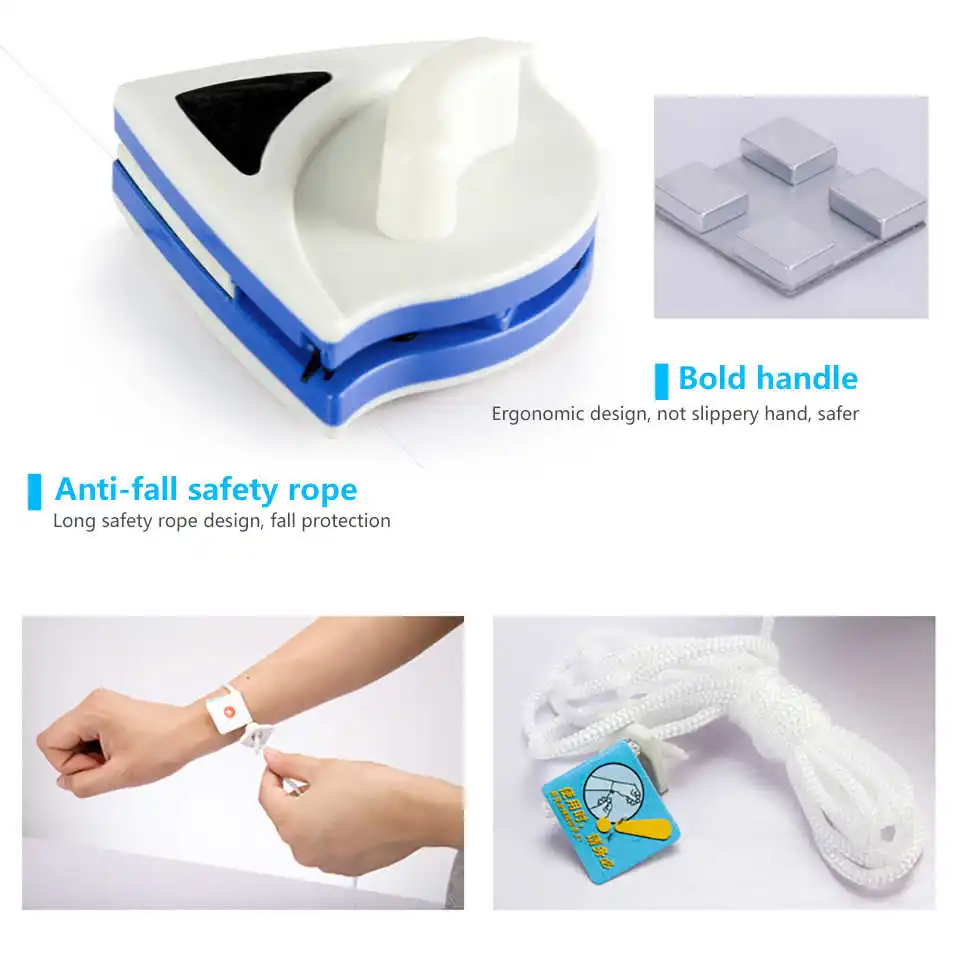 Более безопасный инструмент для очистки окон с защитой от падения и магнитом поставляется с 1 длинной безопасной веревкой для защиты от падения, когда вы используете этот инструмент для очистки окон, веревка будет прикреплена к вашей руке, никогда не падает. Позволяет вытереть стекло более надежно, вы можете очистить снаружи, стоя в комнате;