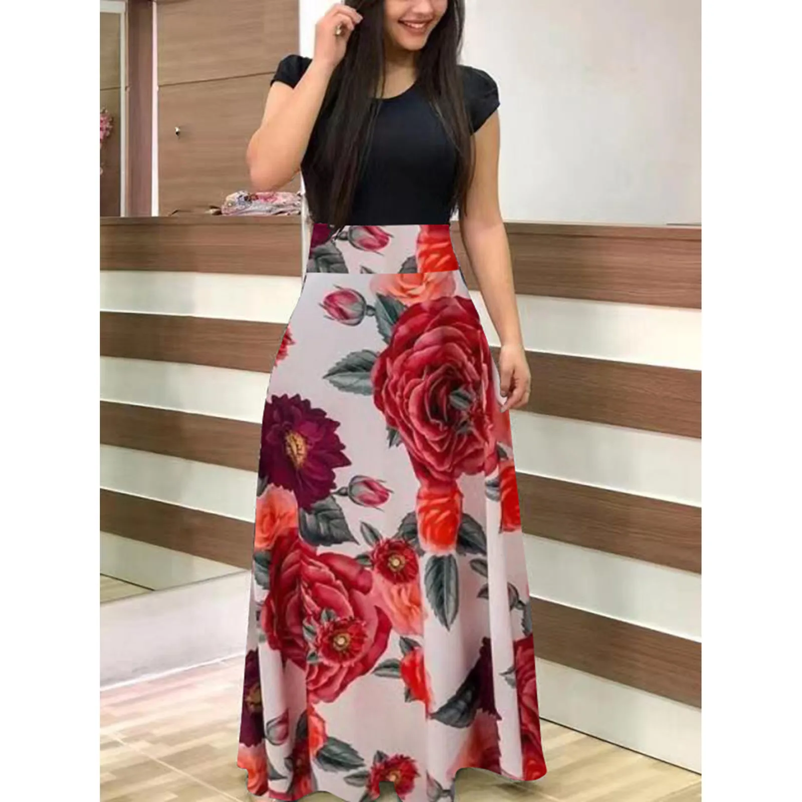 Стильное платье с цветочным принтом, длинная юбка с коротким рукавом, женская одежда