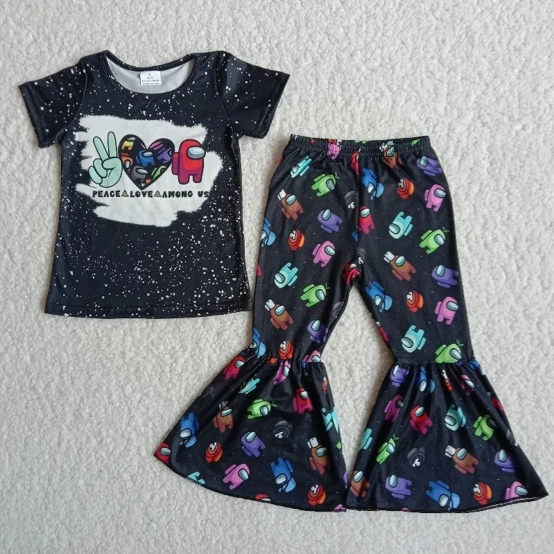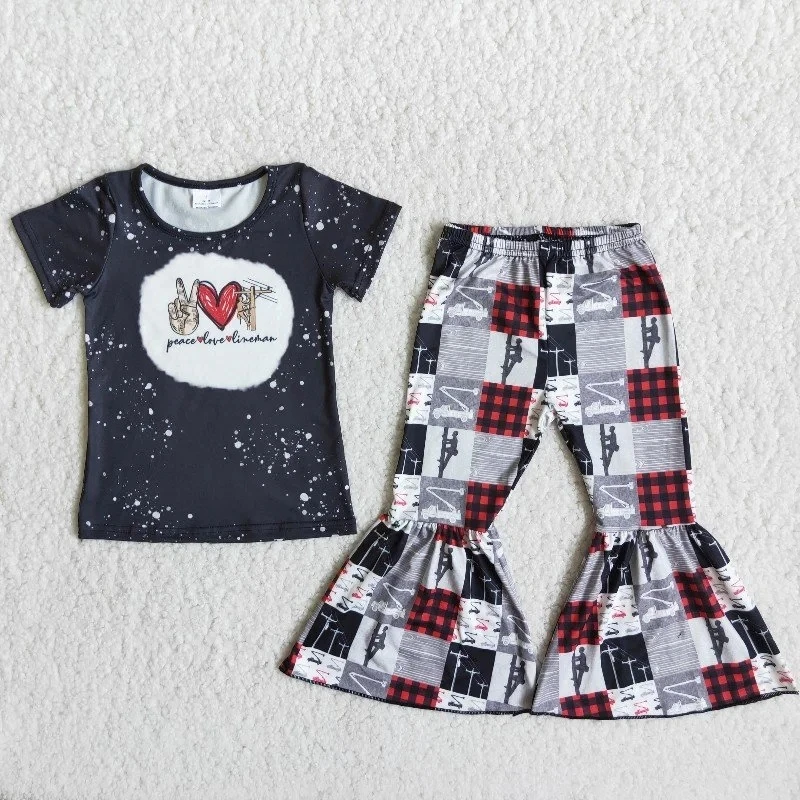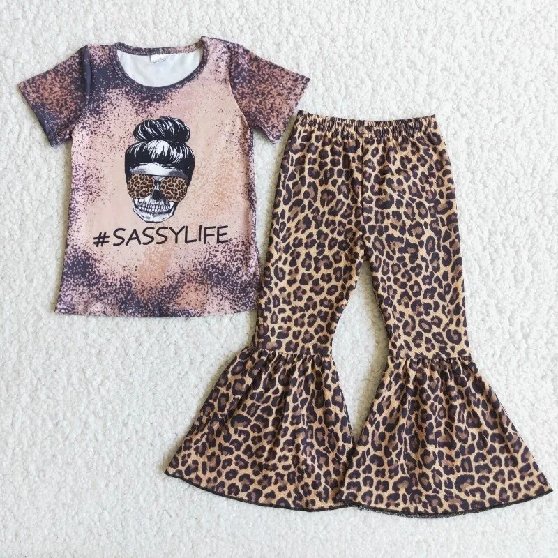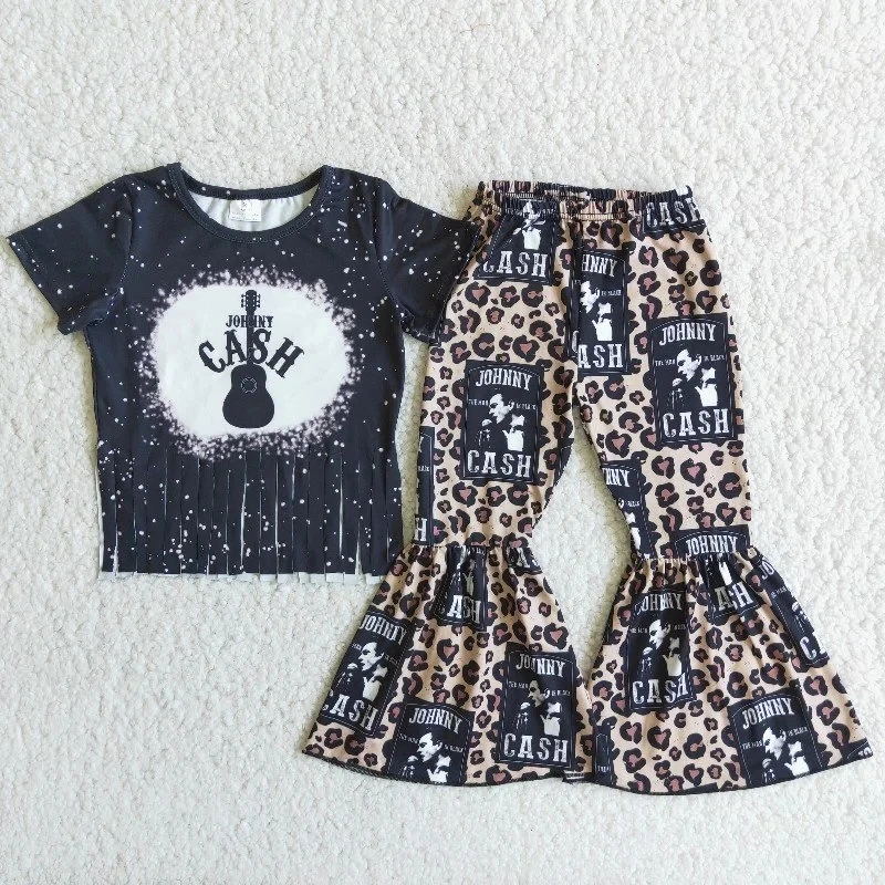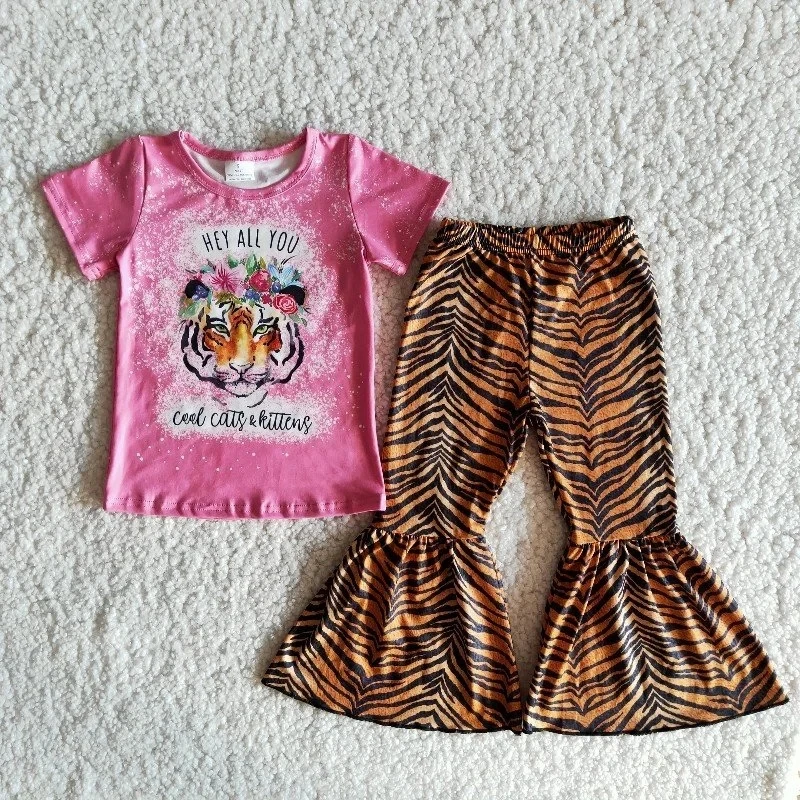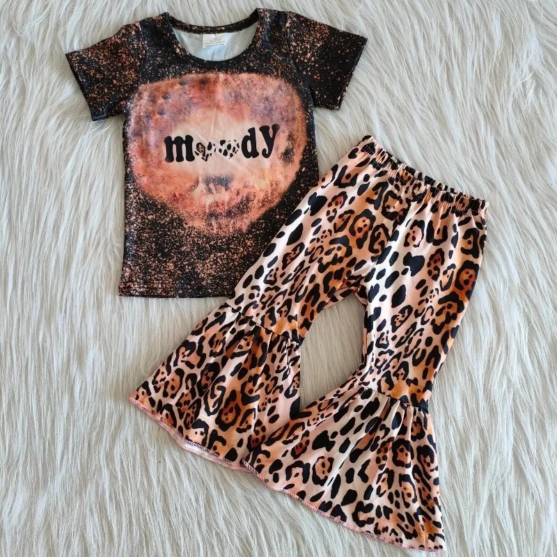 Оптовая продажа, эксклюзивная детская одежда, комплект с коротким рукавом для маленьких девочек, комплект с тёмно-синим галстуком, Детская рубашка, розовые леопардовые штаны с колокольчиками, модный наряд
