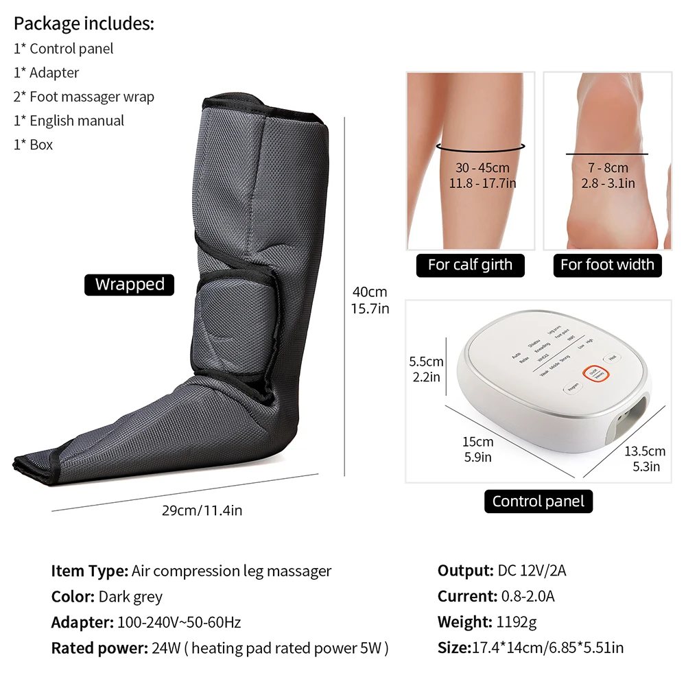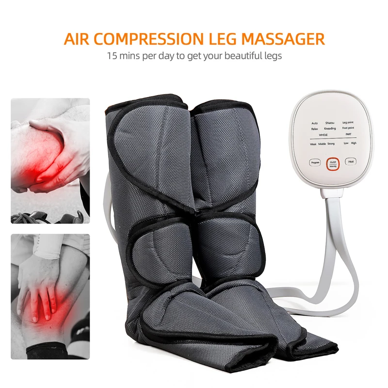 Передовая технология сжатия воздуха используется для изготовления этого воздушного компрессионного массажера для ног. Исследования показывают, что этот массажер может эффективно решить следующие проблемы: все более толстые ноги; Растяжение, вызванное высокими каблуками; Отек ног; Боль в суставах; Дискомфорт в холодные/дождливые дни; overdeveloped икроножных мышц.