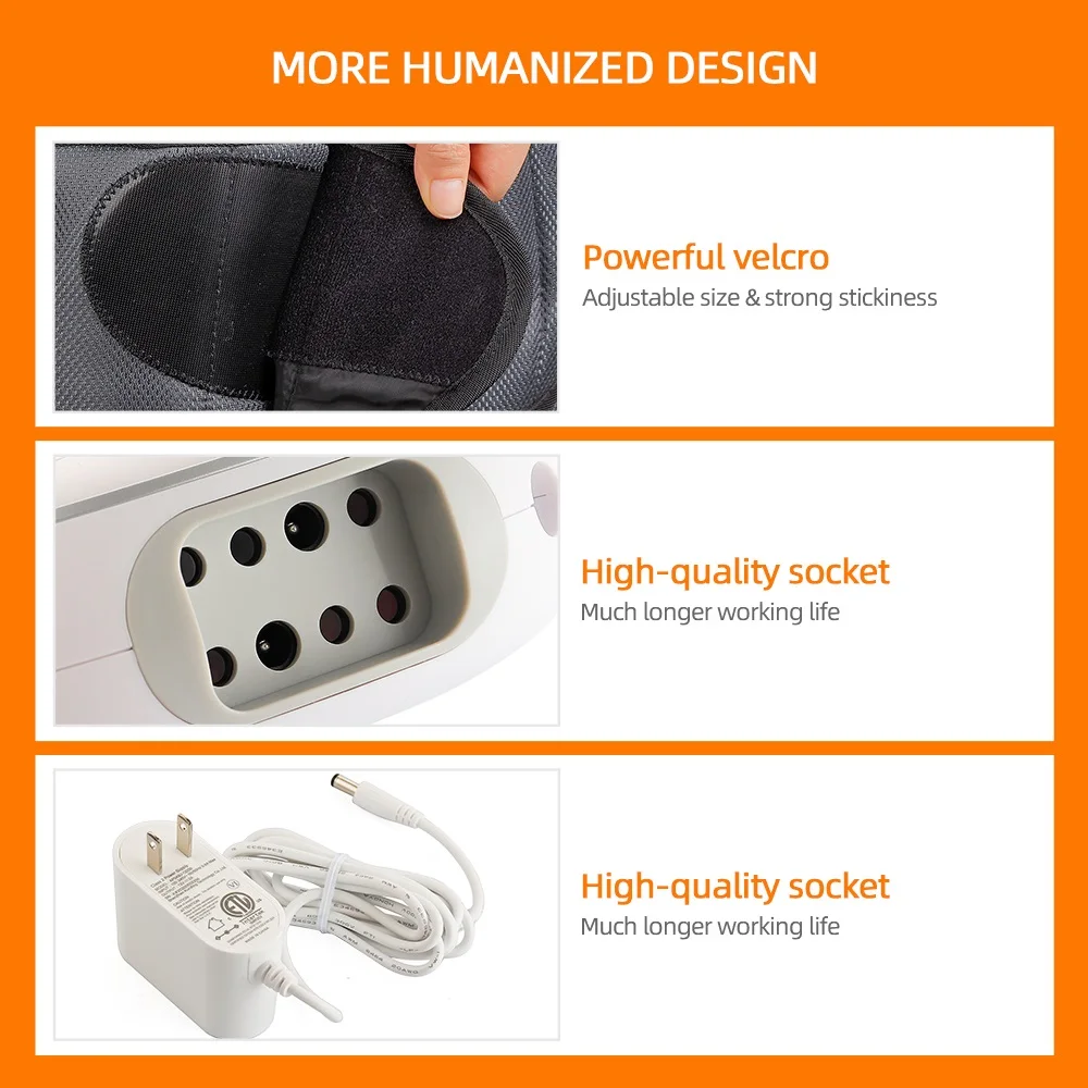 Мощная липучка предлагает нашим массажером Регулируемый размер и сильную липкость, что делает его намного более удобным в использовании. С высококачественной розеткой этот продукт становится более прочным и может использоваться в течение сверхдлительного времени. Более того, его низкое напряжение позволяет каждому, даже ребенку, использовать его с легкостью.