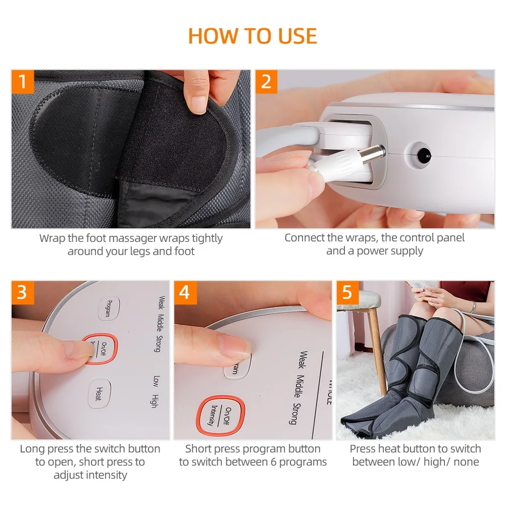 Оберните массажер для ног, плотно оберните ноги и ступню.Подключите адаптер к оберткам и источнику питания.Нажмите и удерживайте кнопку включения, чтобы открыть, и удерживайте кнопку для регулировки интенсивности.Нажмите кнопку программы, чтобы переключиться между 6 программ.Нажмите кнопку тепла для переключения между низким/высоким/нет.