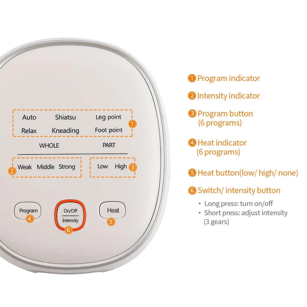 Вы можете переключаться между 6 программ, чтобы наслаждаться различными массажами. Авто включает в себя все программы; Расслабление является легким массажем; Шиацу означает Постоянный и эффективный массаж; Разминание от цыпленка до точки ног и от слабой до сильной; точка ноги включает в себя «разминание» и «Массаж» на ногах; Точка стопы означает «разминание» и «Массаж» На цыпочках и ступне.