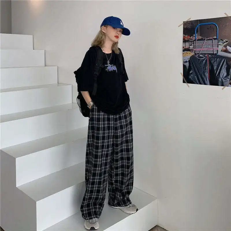 Брюки женские, черные, в клетку, в стиле Харадзюку, уличные, длинные, с широкими штанинами, размера плюс