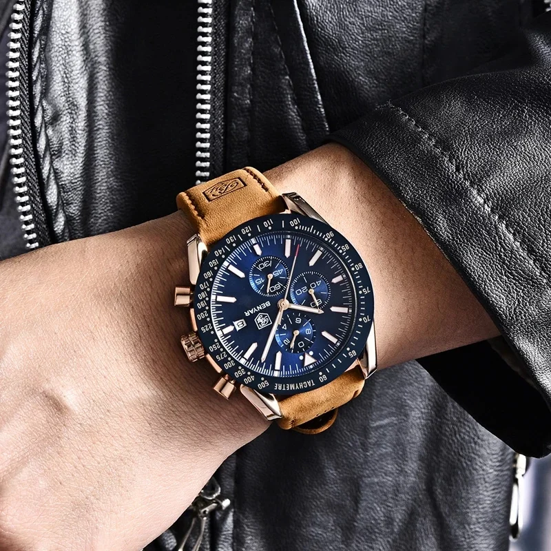 Мужские кварцевые часы с календарем и хронографом, на кожаном ремешке