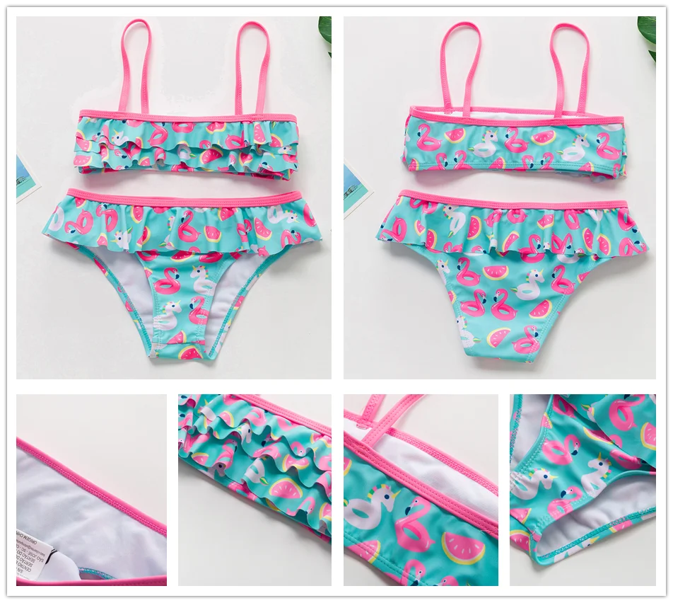 Новый 2021 детский купальный костюм из двух частей с рисунком Фламинго Купальник для девочек, Раздельный купальный комплект 2021 летние бикини комплекты Детские костюмы для плавания; Красивые купальники G1-K337