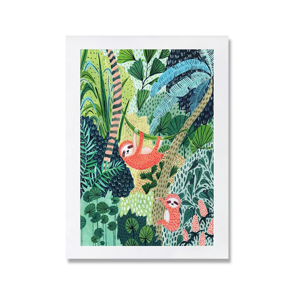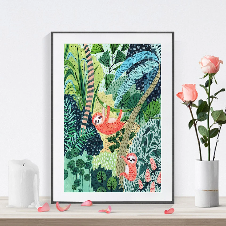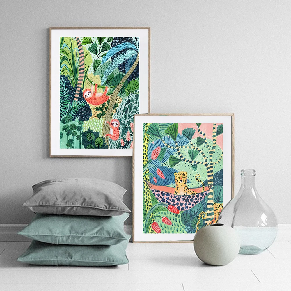 Плакаты и принты Ленивец и леопардов из джунглей, детская Картина на холсте, сафари, растительные настенные картины, детская спальня, скандинавский Декор для дома