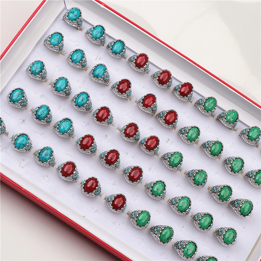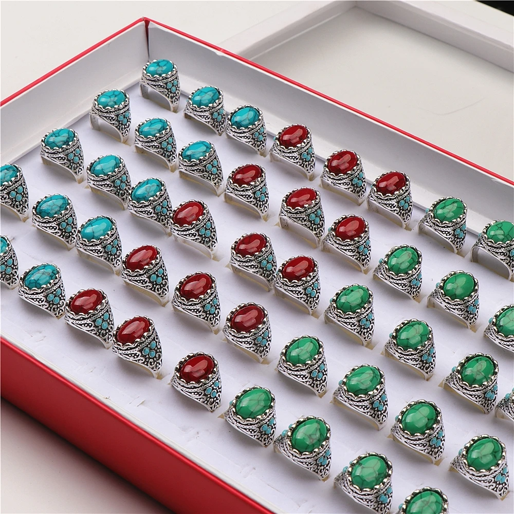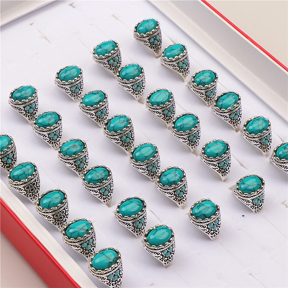 20 шт.лот винтажные разноцветные бирюзовые металлические кольца с натуральным камнем античного серебра для женщин ювелирные изделия для свадебвечерние подарки