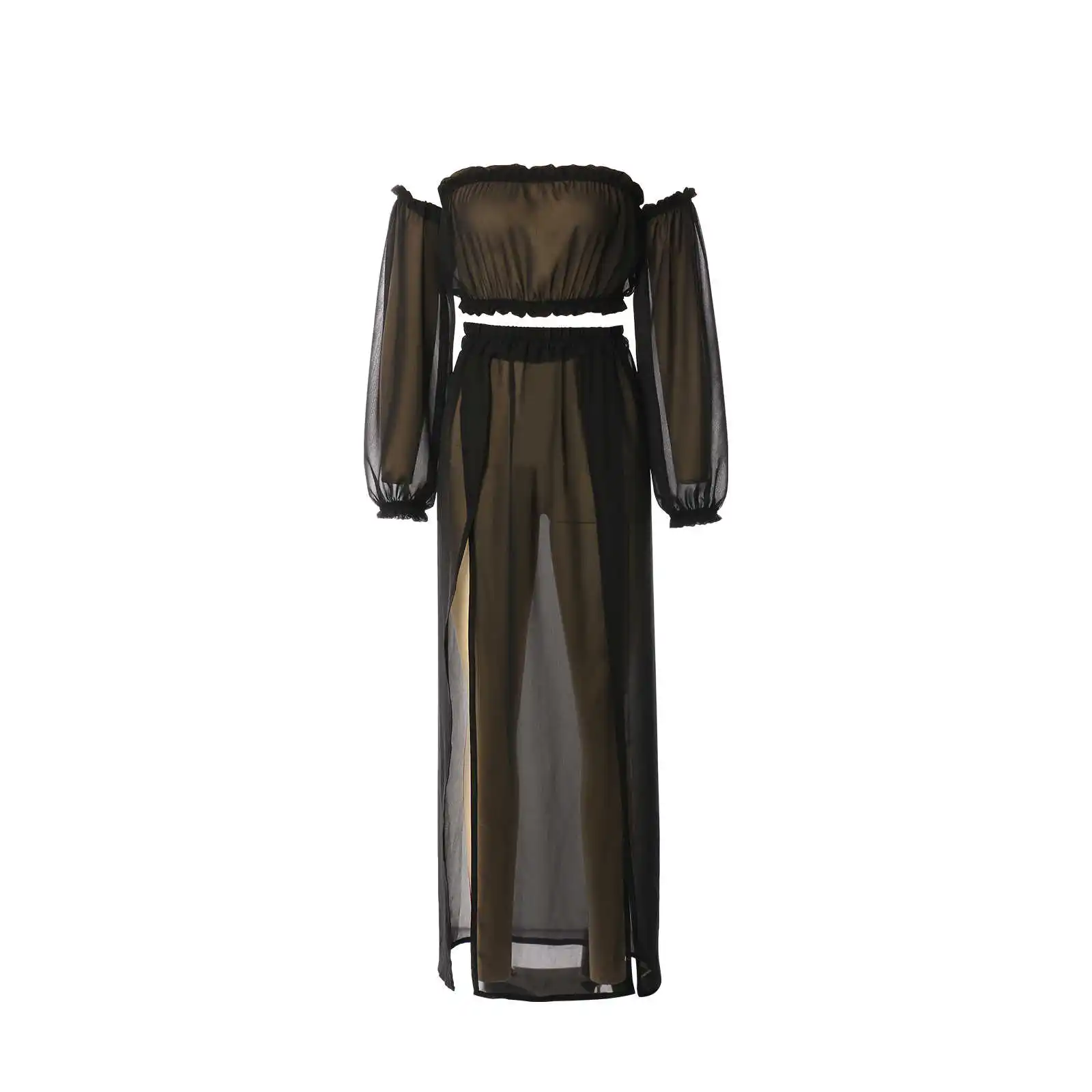Женская сетчатая прозрачная накидка на бикини, комплект из двух предметов, укороченный Топ с длинным рукавом и юбка-накидка, купальник, пляжные платья