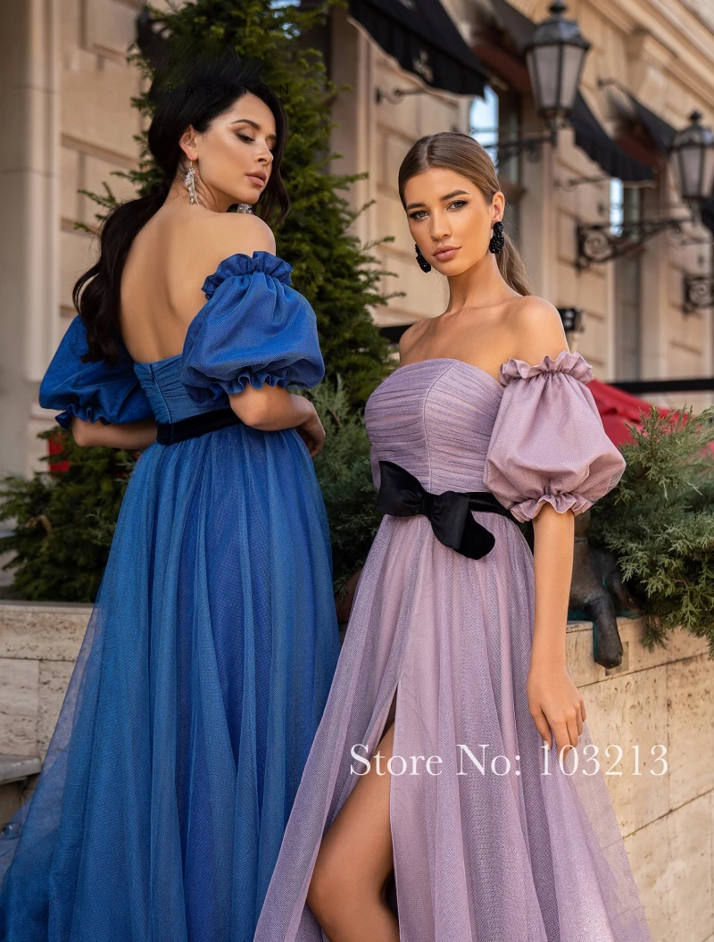 Сиренево-синие платья для выпускного вечера, с открытыми плечами, с пышными рукавами, с разрезом спереди, арабские вечерние платья для выпускного вечера, 2021 г.