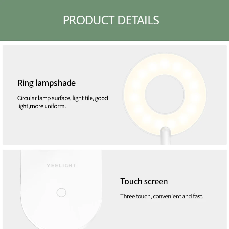 ● Три режима для яркости● Несколько способов зарядки● Сенсорный переключатель● Кронштейн лампы на 360 °● Мягкое освещение● Кольцевая светящаяся поверхность