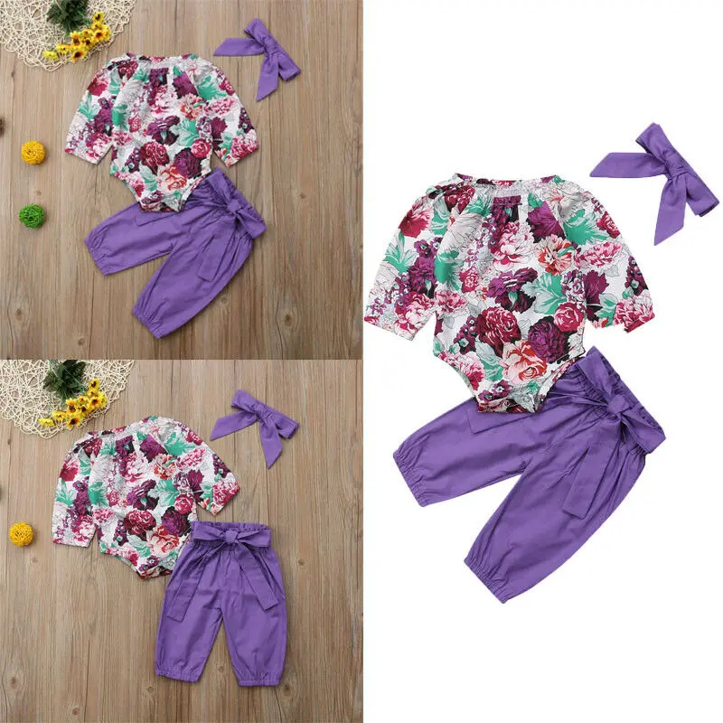 Хлопковый комбинезон с цветочным принтом для новорожденных девочек, длинные брюки, повязка на голову, наряды, одежда