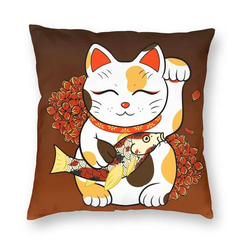 Манэки-нэко с рыба-подушка крышка размером 45*45, декоративная домашний декор 3D печати Япония Lucky Cat Подушка Чехол для дивана двухсторонняя