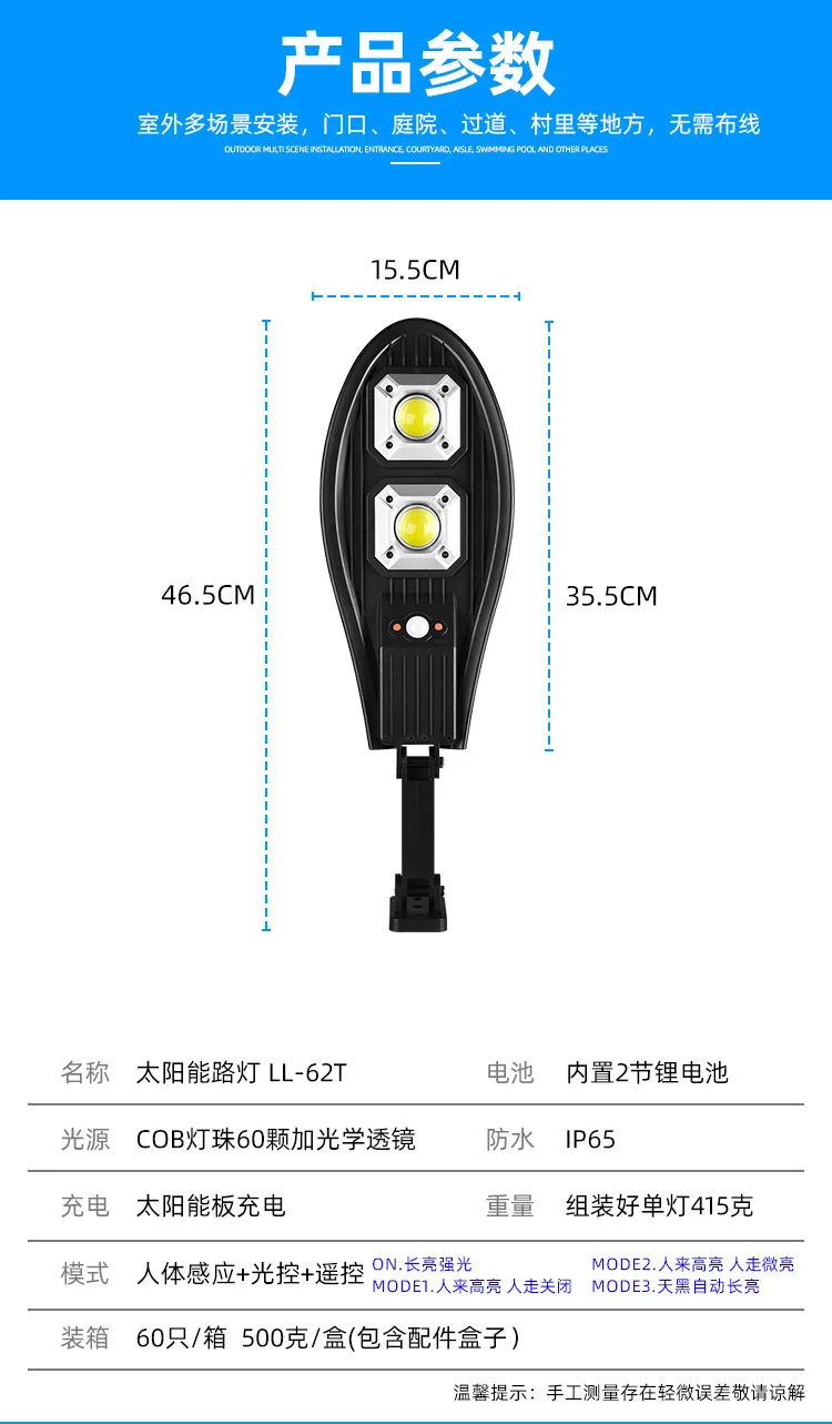 1. Солнечная панель: 6 В2. Батарея: 3,7 V 4000 -6000 mAh ,18650 литиевая батарея3. Светодиодный: белый светильник4. Размер: 55*37 см/46,5*35,5 см5. Светодиодный Цвет: белый6. Способ установки: винты7. Режим работы: 3 различных режима освещения8. Материал: АБС-пластик + Поликарбонат9. Время работы: может работать более 5-24 часов10. Переключатель: пульт дистанционного управления11. Водонепроницаемость: IP66