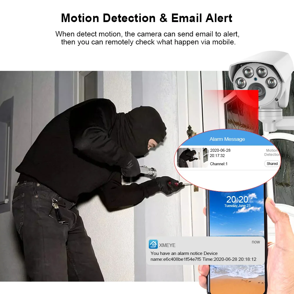 Когда кто-то ворвется в область съемки, камера сделает звуковой сигнал и сигнал тревоги будет передвинут в приложение вашего телефона. И когда он обнаруживает движение, 4 белый светодиодный светильник s будет светильник, показывая вам цвет ночной сцены.