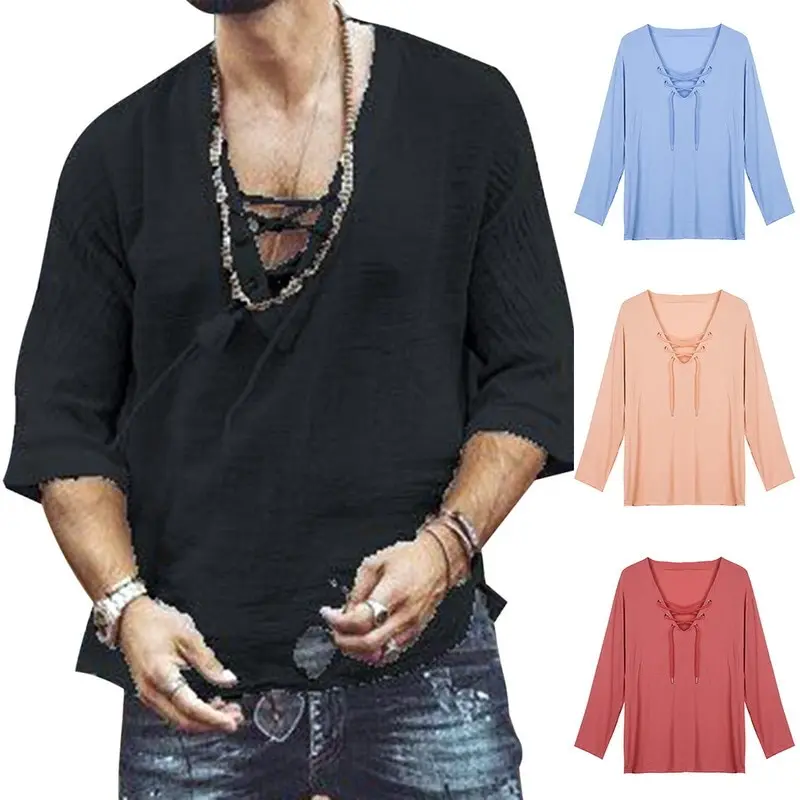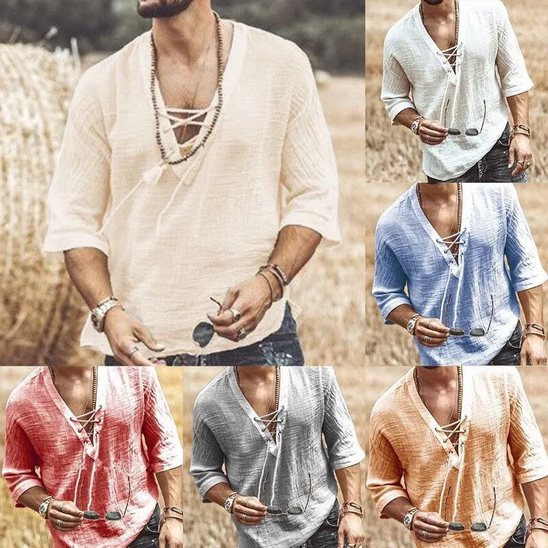 Новинка эпохи Возрождения, средневековый косплей, костюм на Хэллоуин, мужская рубашка с V-образным вырезом, винтажная рубашка на шнуровке, льняная блузка с коротким рукавом, Топ