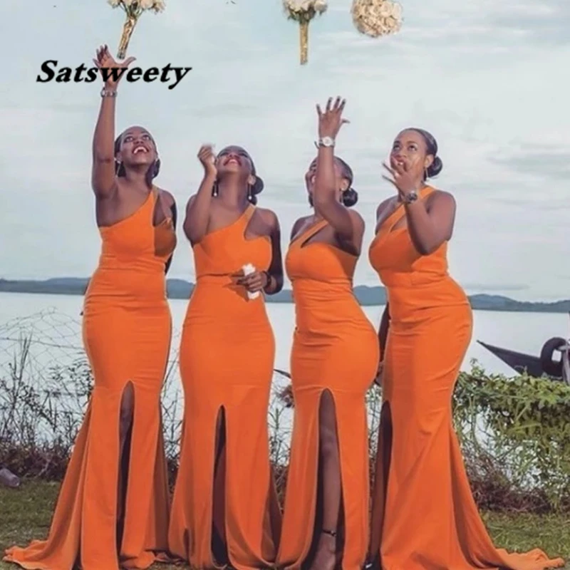 Новейшие оранжевые длинные платья подружки невесты русалка 2022 на одно плечо с разрезом Африканское женское платье для свадебной вечеринки платья