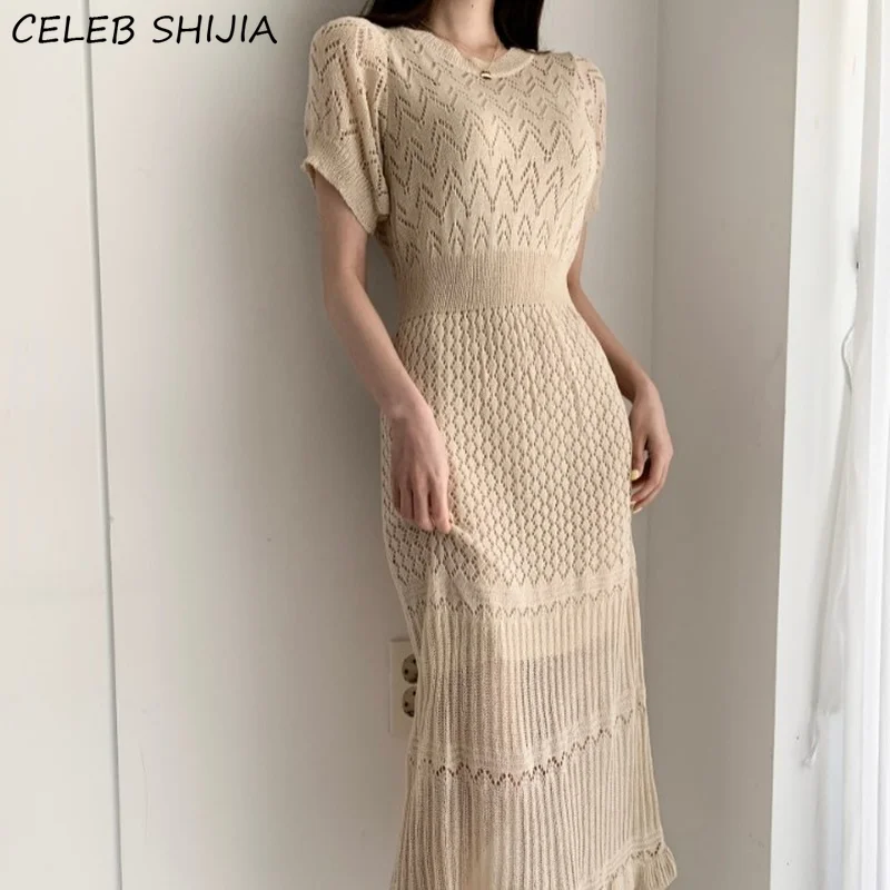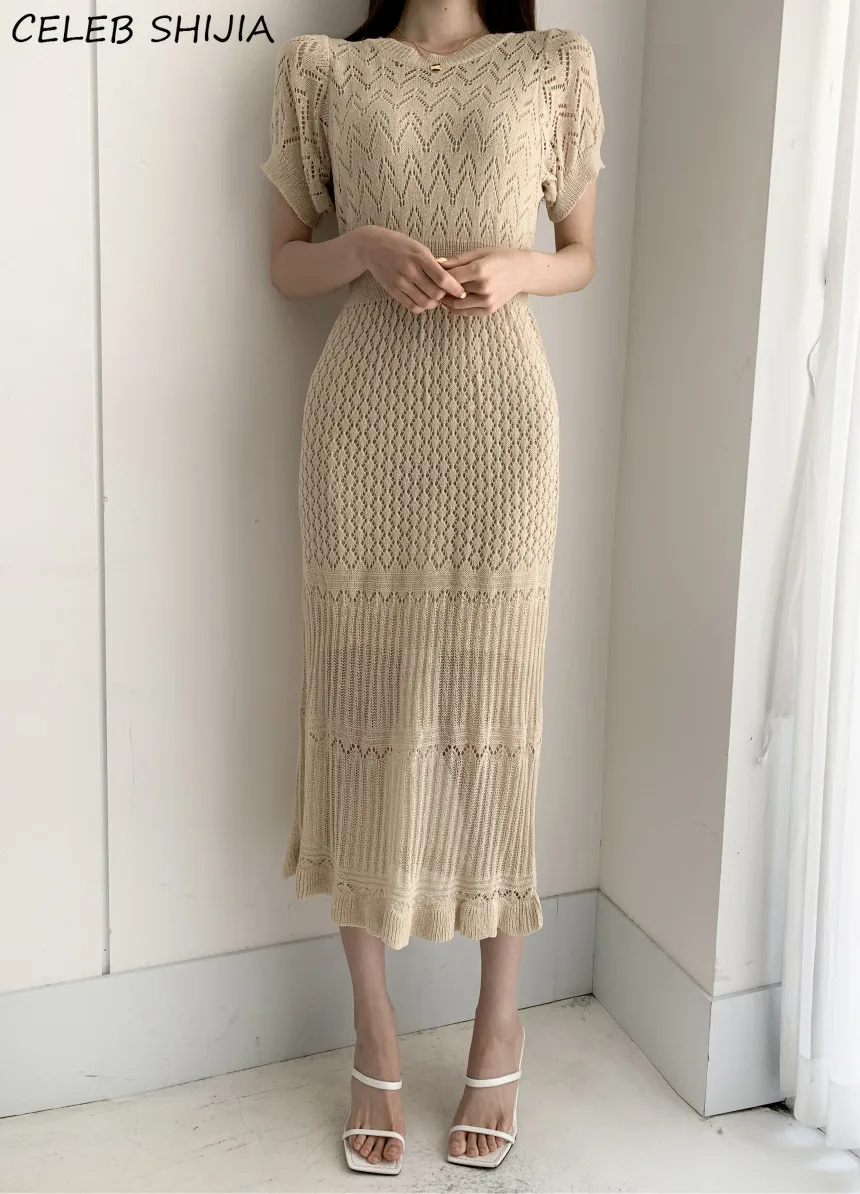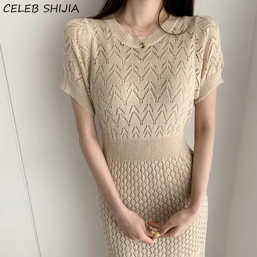 Женское трикотажное платье с высокой талией, элегантное приталенное платье абрикосового цвета с круглым вырезом, лето