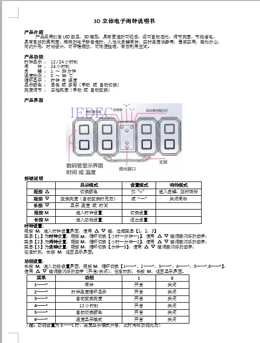 Комплектация продукта: 3DA часы, usbOne шнур питания, кнопка памяти Батарея, одно руководство по эксплуатации. Размер продукта 220*75 мм, разъем USBPort для использования грузового или мобильный телефон-адаптер