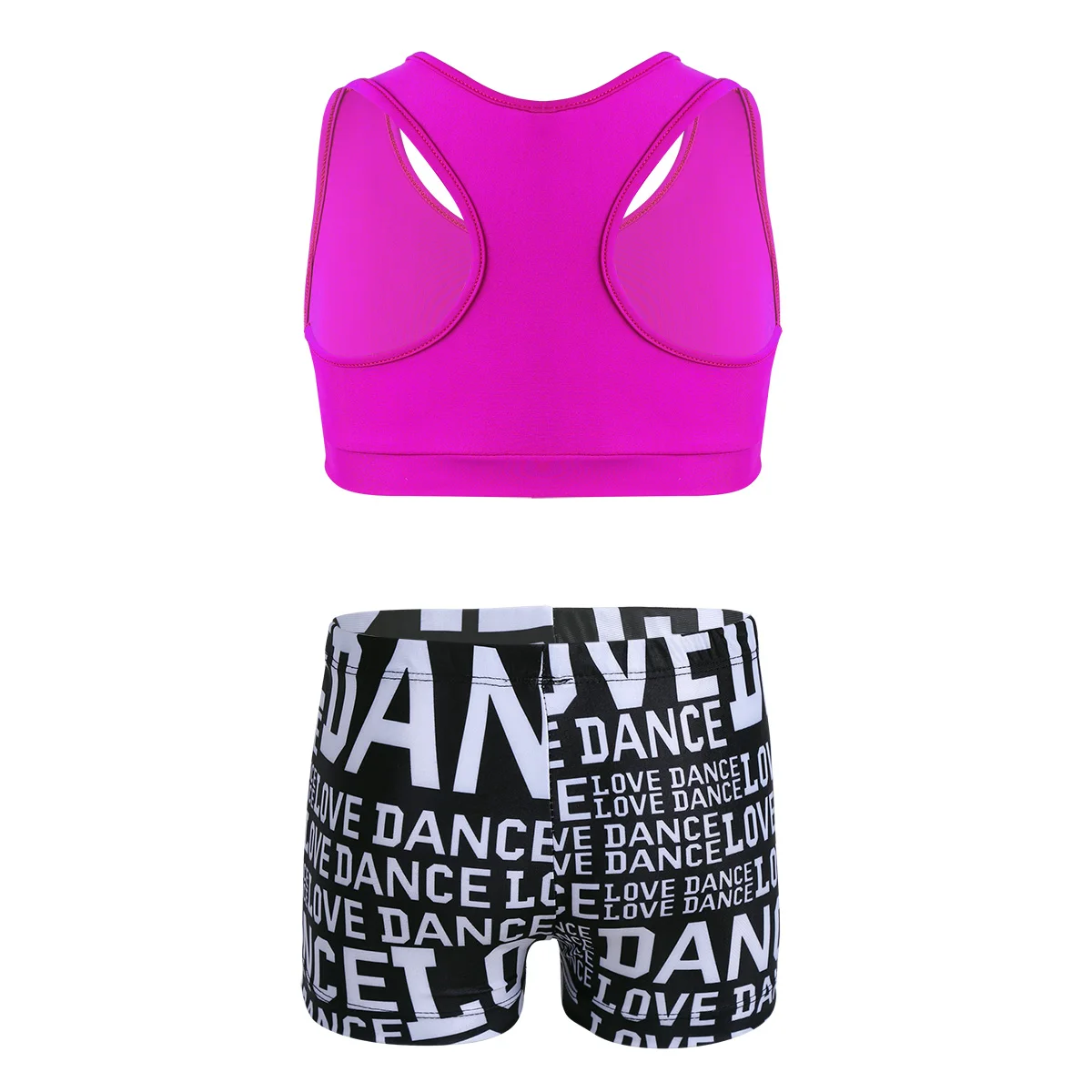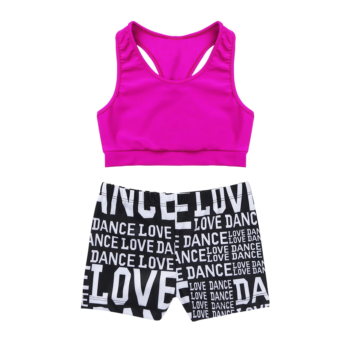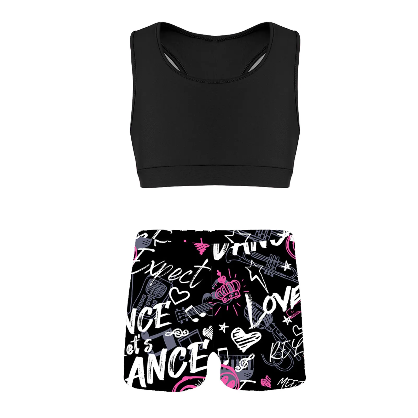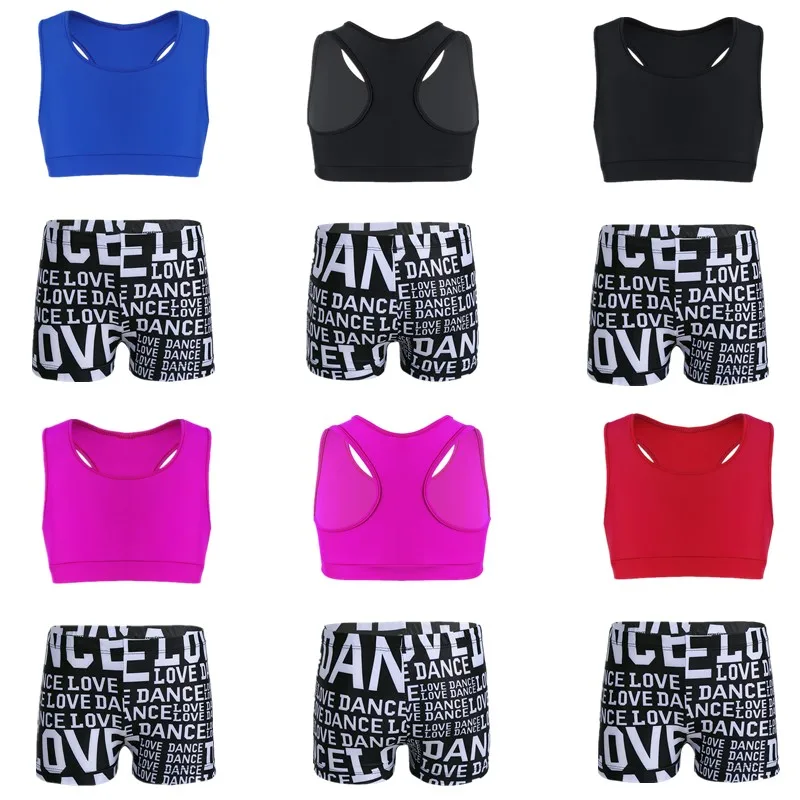 Особенности:Одежда изготовлена из полиамида и спандекса, ручная стирка.Таблица размеров означает возрастные диапазоны для девочек, но они предназначены только для общего ознакомления.Майка-борцовка сзади, однотонная. Эластичная ткань, удобная и дышащая.Подходящие низ с буквенным принтом и эластичным поясом. Спортивный комплект для вашей девочки.Подходит для занятий танцами, гимнастическое упражнение, выступлений на сцене и т. д.
