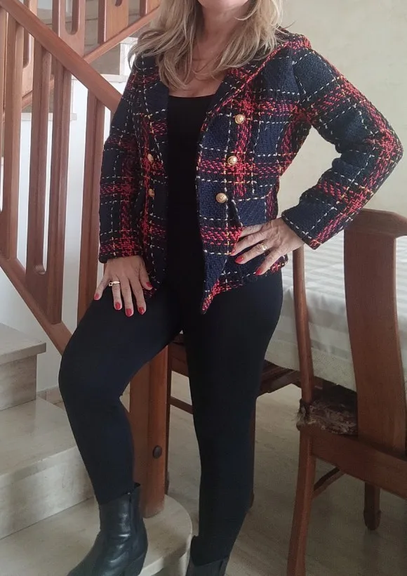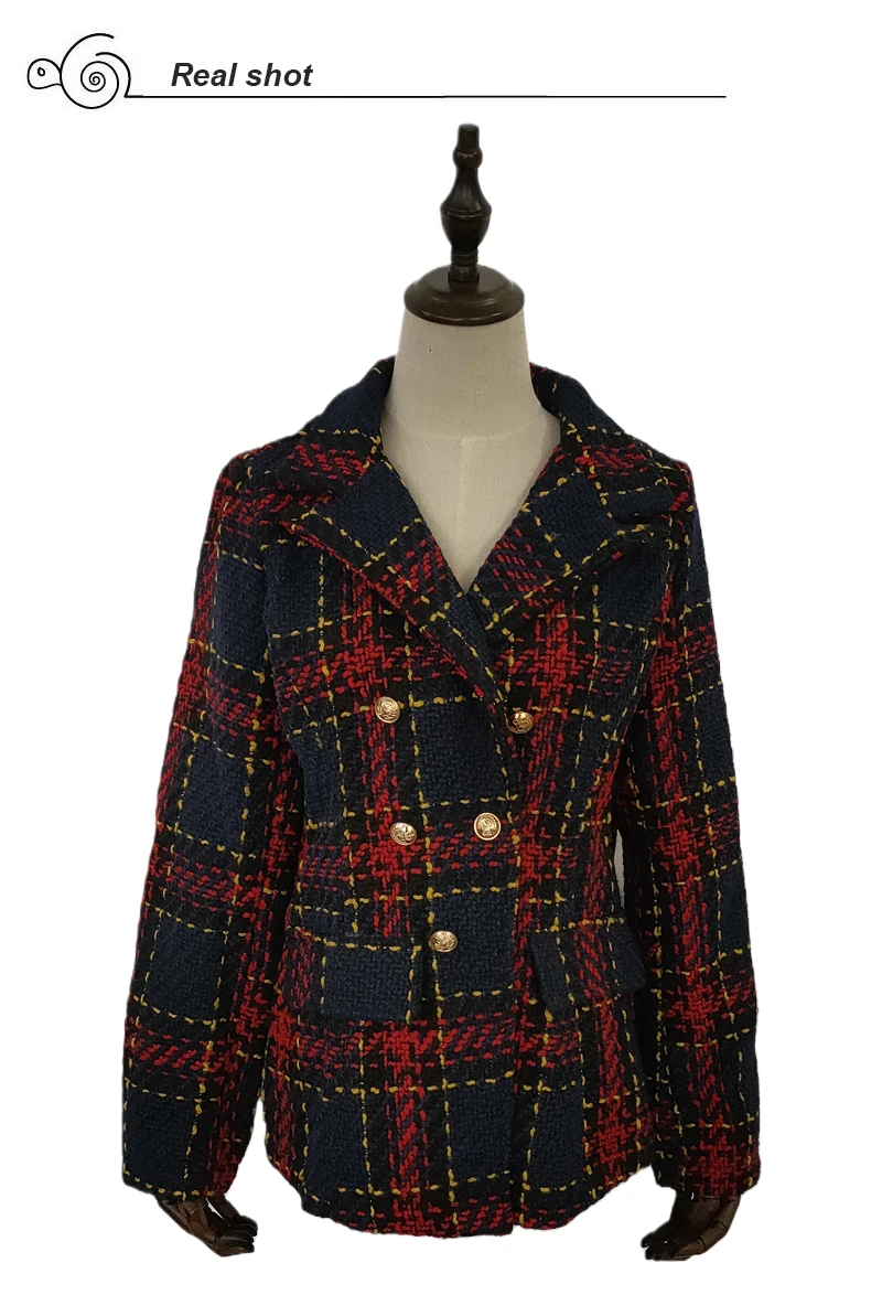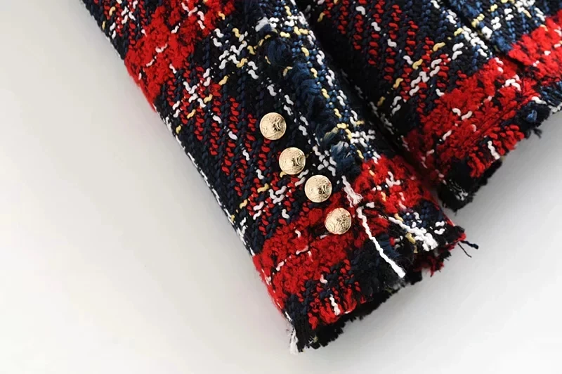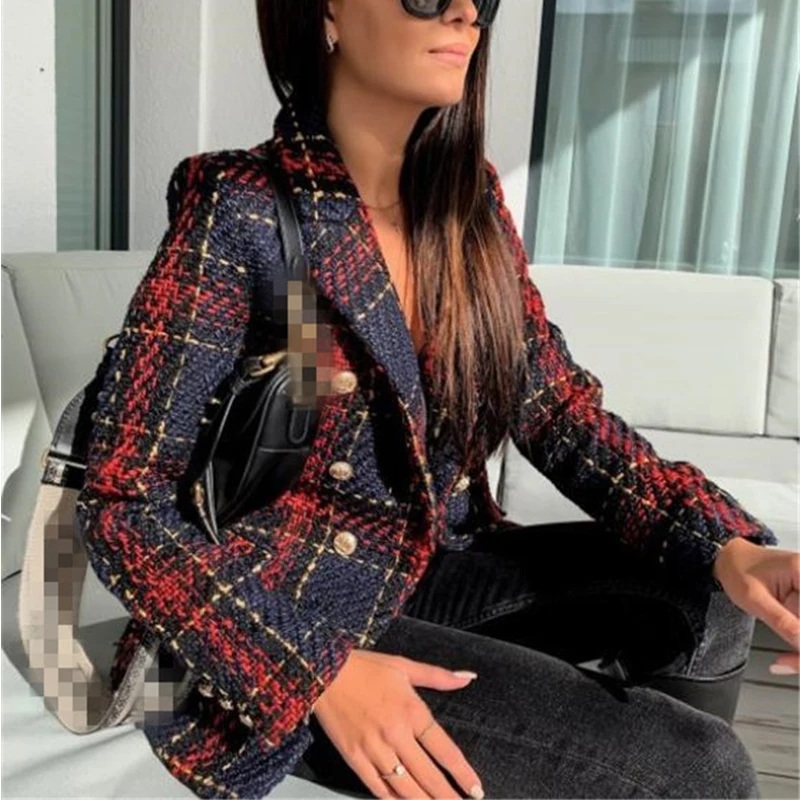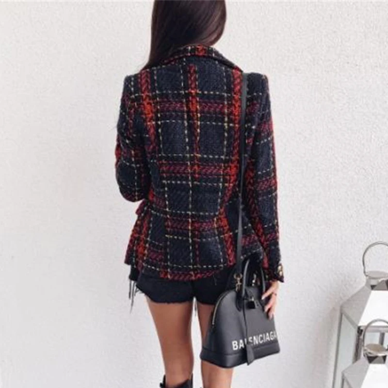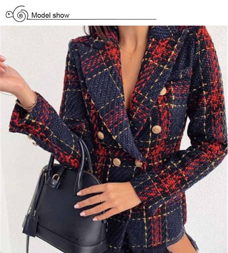 Женский твидовый блейзер в клетку, двубортный офисный пиджак с длинным рукавом и английским воротником, красные блейзеры для женщин на весну и осень