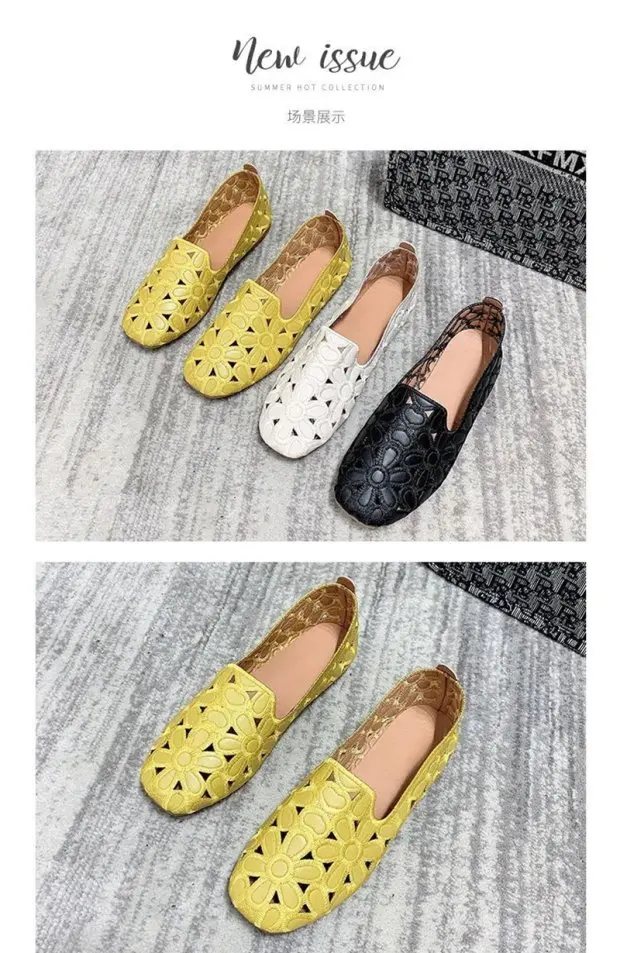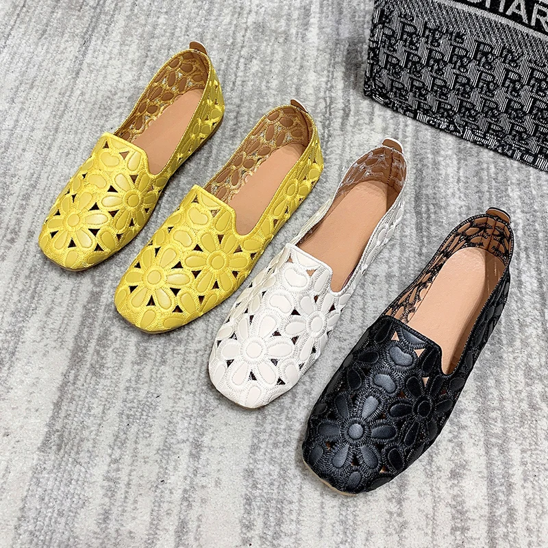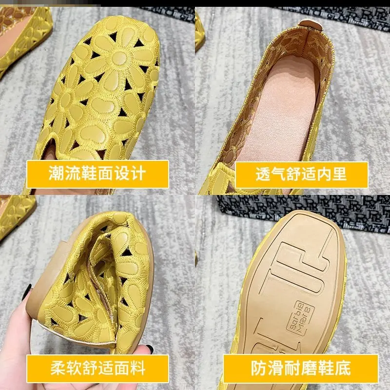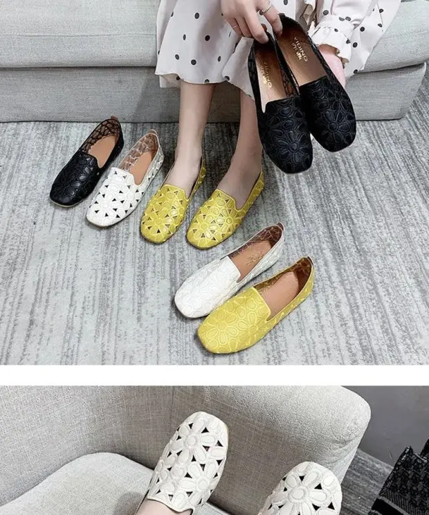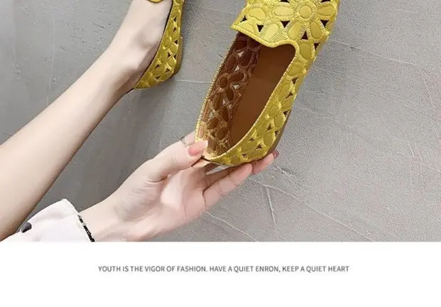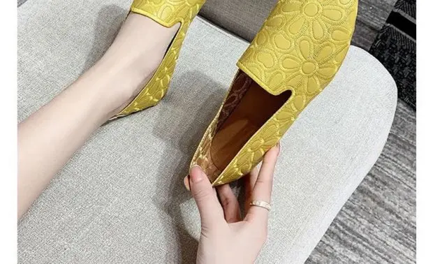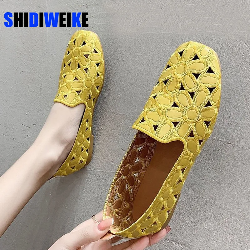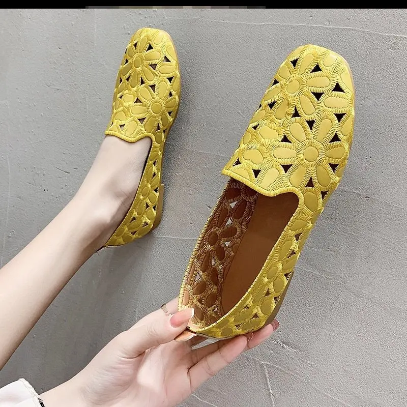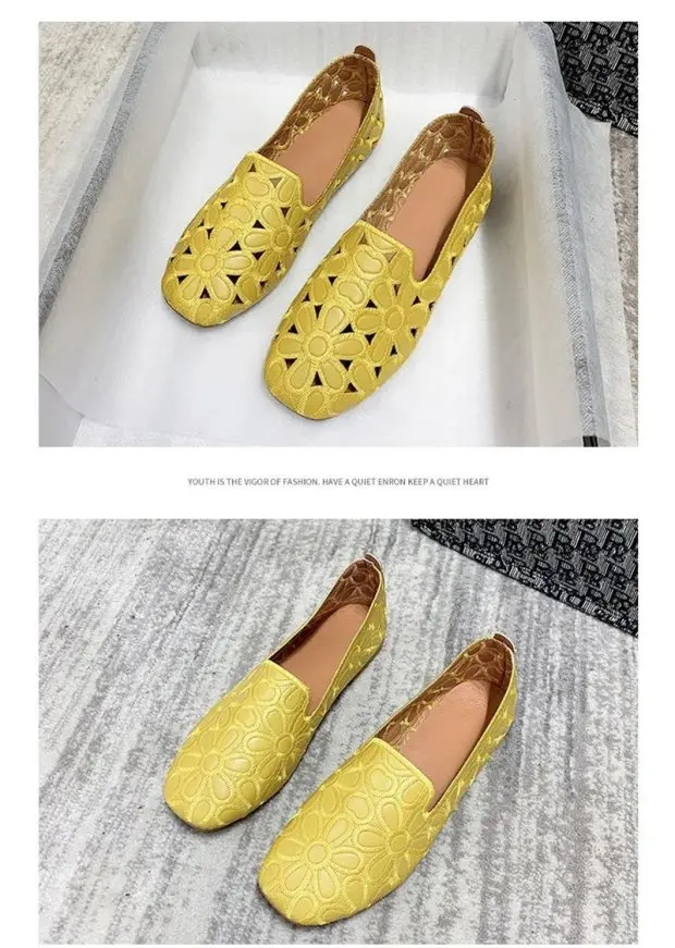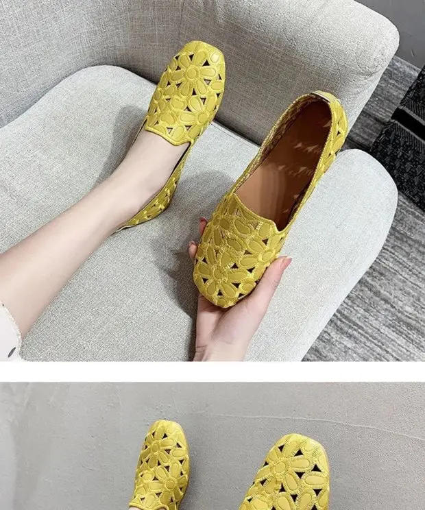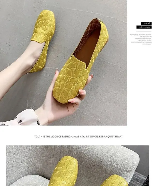 Желтые лоферы с квадратным носком; Женская обувь из мягкой кожи на плоской подошве; Размеры 35-42; Женская обувь на плоской подошве с перфорацией; Женские лоферы на плоской подошве с вышивкой; AD211