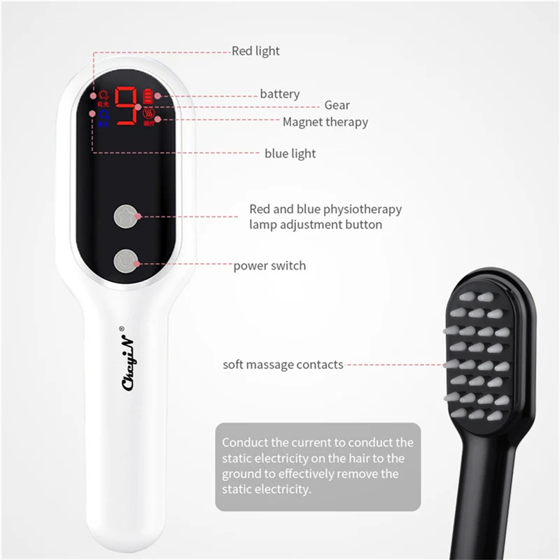 1. Красный и синий светильник проникают внутрь клеток эпидермиса, достигают корня волосяного фолликула, глубоко питают корень волос, снимают давление с головы, подавляют секрецию масла, предотвращает закупорку пор и делает корни волос сильными и гладкими.2. Можно отрегулировать 5 режимов и 9 передач, режим и передачу можно менять в соответствии с их собственной ситуацией.3. 26 мягких массажных контактов и магнитная физиотерапия могут массировать голову, улучшать кровообращение, а высокочастотная вибрация может способствовать росту волос.4. Большой светодиодный экран, рабочая передача и режим, с первого взгляда.5. Проведите ток, чтобы провести статическое электричество на волосах на землю, чтобы эффективно удалить статическое электричество.6. Память выключена, в следующей загрузке не нужно сбрасывать, значительно повышает эффективность, экономит время.7. Литиевый аккумулятор большой емкости USB, удобная зарядка, долгий срок службы.