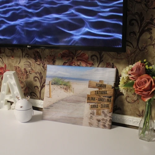 У продавца можно выбрать готовый рисунок, на заказ он впишет имена. Нужно просто ему отправить смс из текстом. Можно выбрать не только рисунок, а и размеры. К сожалению рамка в комплект не входит. Я выбрала размер 30см*40см, только сейчас не могу найти рамку такого размера. Поэтому показываю картину как могу), а в будущем она должна выглядеть немного иначе. Перед заказом рекомендую выбирать стандартные размеры. Ну а сам холст мне понравился.