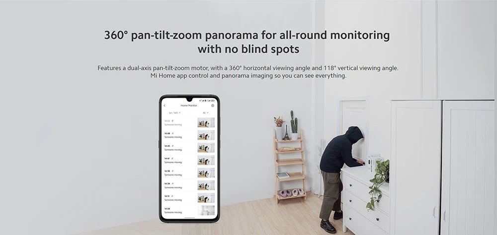 Имеет двухосевой панорамируемый зум-мотор с углом обзора 360 ° и углом обзора 118 ° по вертикали. Управление приложением Mi Home и панорама изображения, так что вы можете увидеть все.