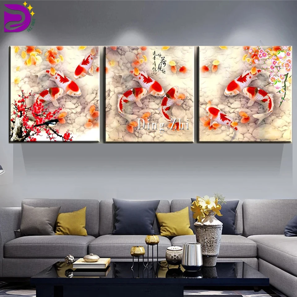 Алмазная 5D картина сделай сам, Набор для вышивки крестиком с квадратными и круглыми рыбами кои, с изображением животных, цветущей сливы, мозаика в китайском стиле, Триптих