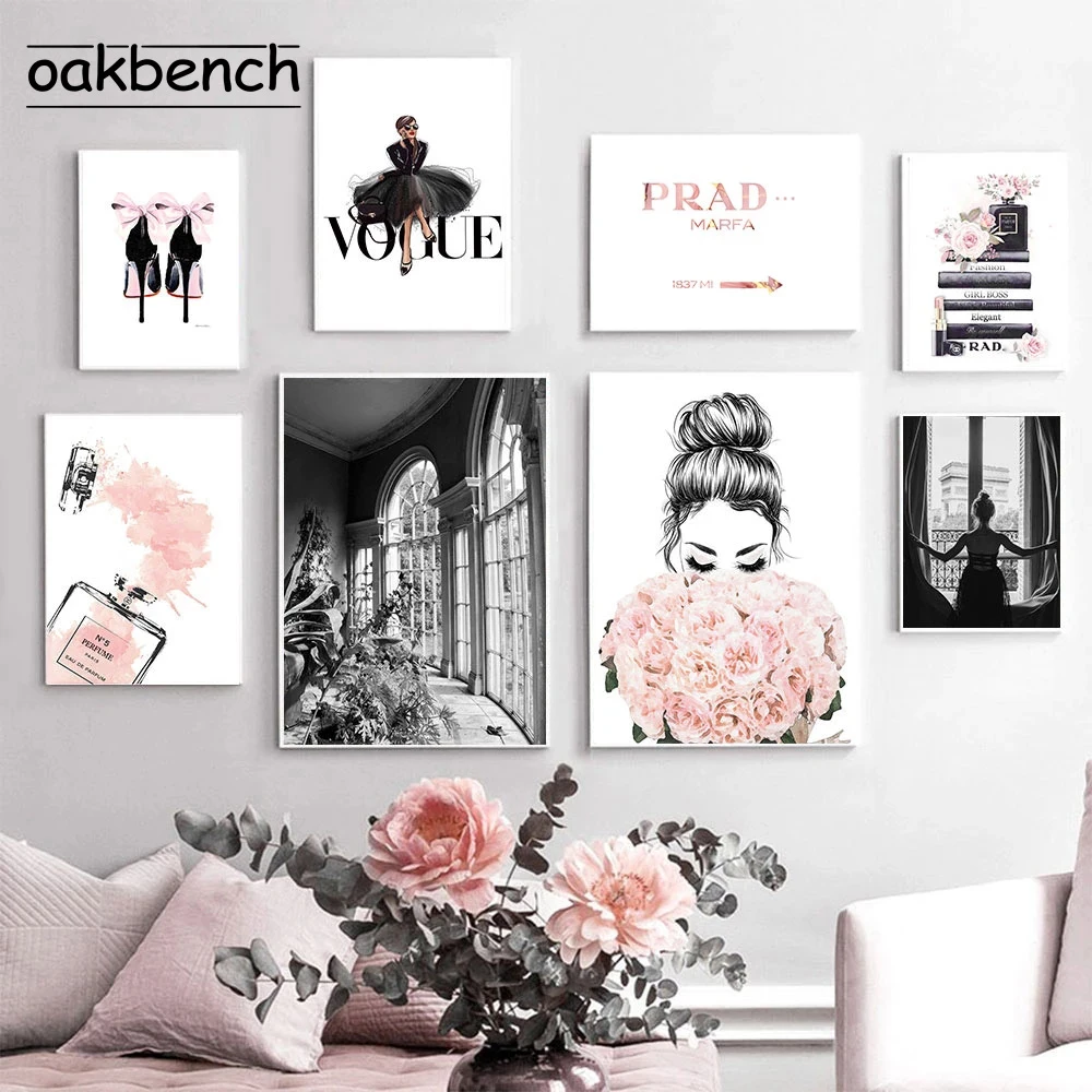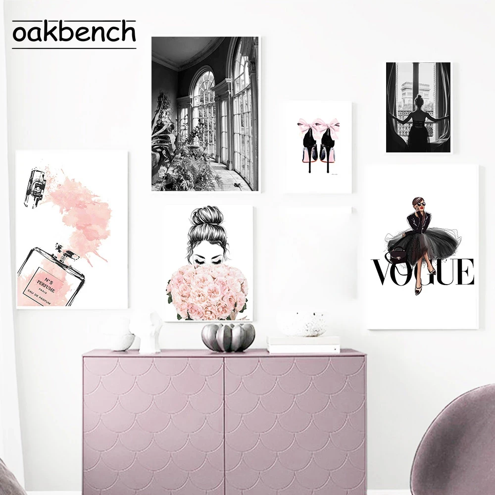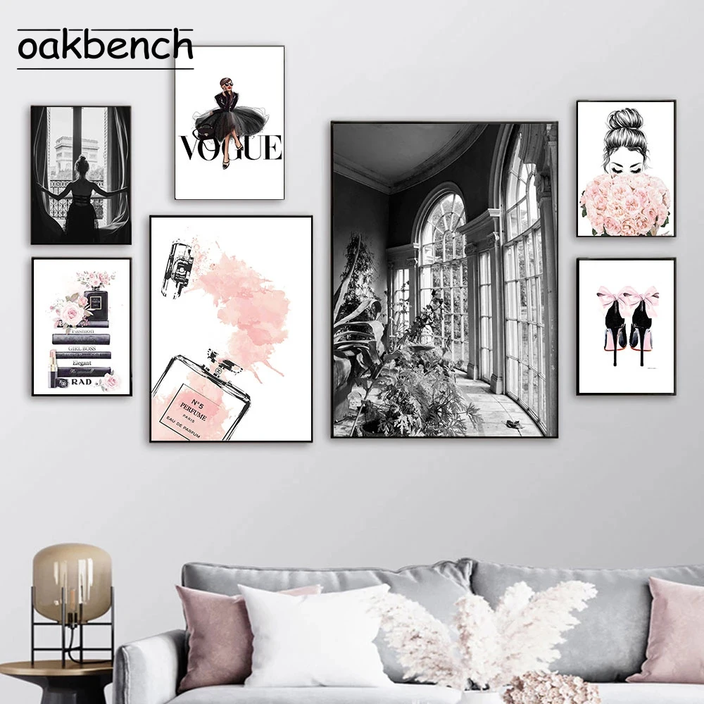 Картины на холсте в скандинавском стиле, модные постеры с цветами для девушек, печать флакона духов, постер с окошком, современные настенные картины, декор для гостиной