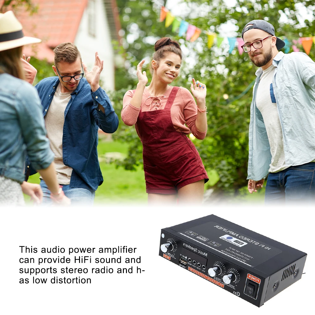 Этот усилитель звуковой мощности подходит для использования во многих местах, таких как дом, автомобиль и так далее.Этот Стереоусилитель мощности поддерживает беспроводное соединение bluetooth и поддерживает tf-карту, AUX и u-диск.Этот цифровой усилитель звуковой мощности оснащен высокими частотами, басами и регулятором громкости.Этот bluetooth аудио усилитель мощности является низким искажением и может обеспечить более мощный звук.Этот усилитель звуковой мощности разработан с функцией дистанционного управления и прост в эксплуатации и использовании.
