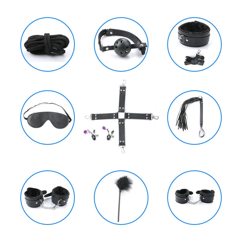 1. Этот продукт мягкий и удобный, с пуховой подкладкой, как незаменимый набор для сексуальных игр для бесследных безграничных игр.2. Ослепление: слепое Зрение для улучшения чувствительности сенсора и создания интенсивной и захватывающей атмосферы.3. Воротник: с веревкой легко покорить ее.4. Скобы и скобы для лодыжки: они сделаны из мягкой кожи с плюшевой подкладкой с регулируемой длиной и съемной пряжкой для рук и ног, чтобы играть в игры плавно.5. Кнут: Изготовлен из специальной кожи без боли. Вы будете наслаждаться трепетом супер-соблазнения с кнутом.6. Заглушка для рта: заглушка для рта имеет воздушные отверстия для свободного дыхания. Вы можете испытать сексуальные игры, когда она беспомощна и не имеет права говорить.7. Парча: привлекательная и привлекательная, разнообразие стилей
