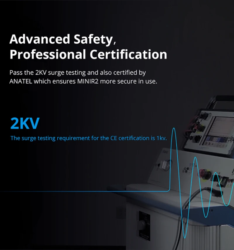 Пройдите испытание перенапряжения на 2 кВ, а также сертифицировано анателем, что обеспечивает более безопасную работу MINIR2.