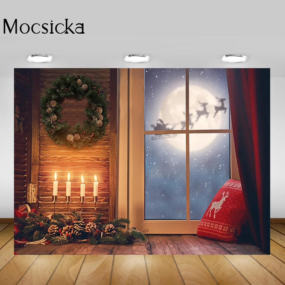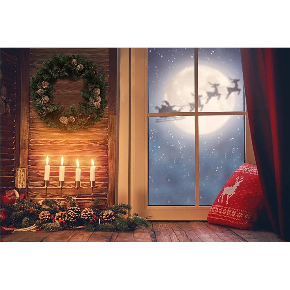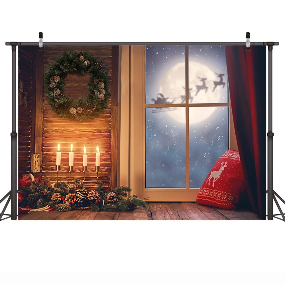 Фон для фотосъемки с изображением рождественского окна, зеленый, зима Свеча-гирлянда, с изображением снежного лося, реквизит для семейной вечеринки