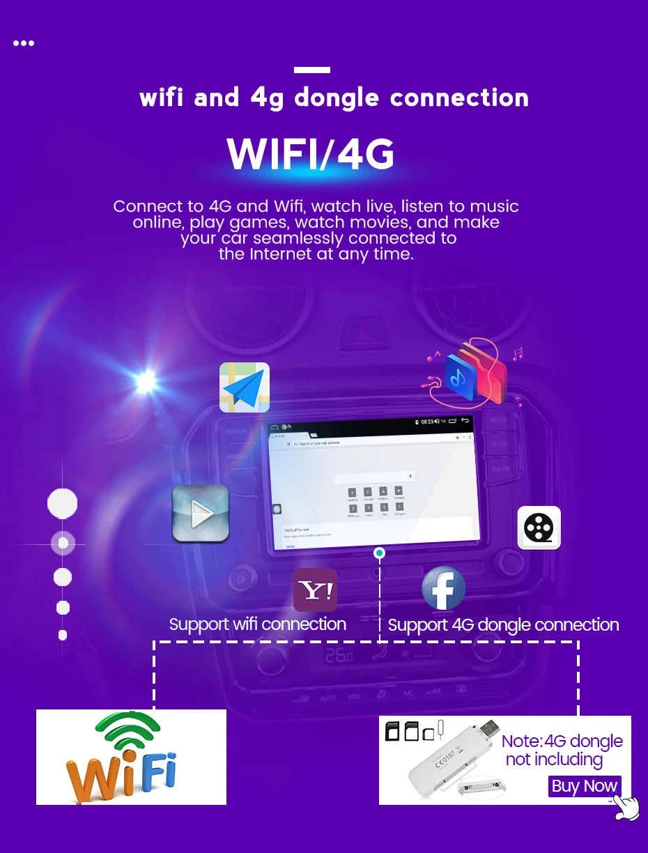 Благодаря сети 4G и встроенному Wi-Fi вы можете наслаждаться серфингом в Интернете независимо от того, где вы находитесь, что делает его возможным для онлайн-навигации/музыки/кино и т. Д. Перед включением устройства вставьте sim-карту.
