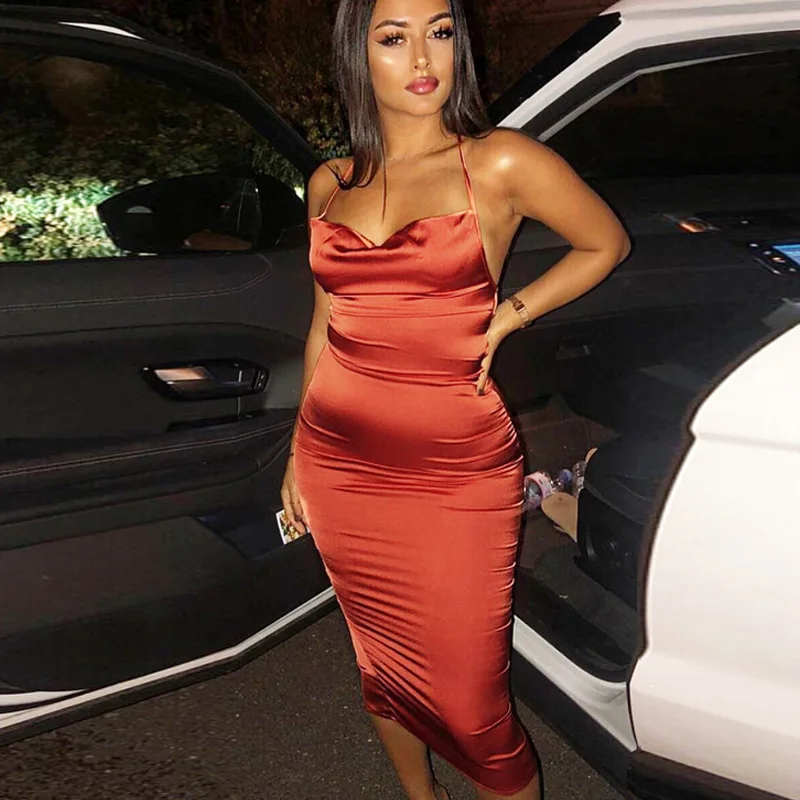 Новинка лета 2021, неоновое атласное облегающее платье средней длины, женское вечерние ное вечернее платье без рукавов с открытой спиной, сексуальное характерное платье
