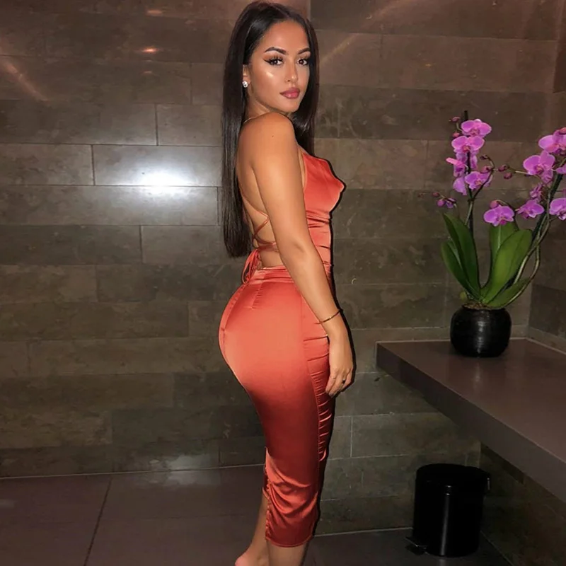 Женское атласное платье миди, на шнуровке, с открытой спиной