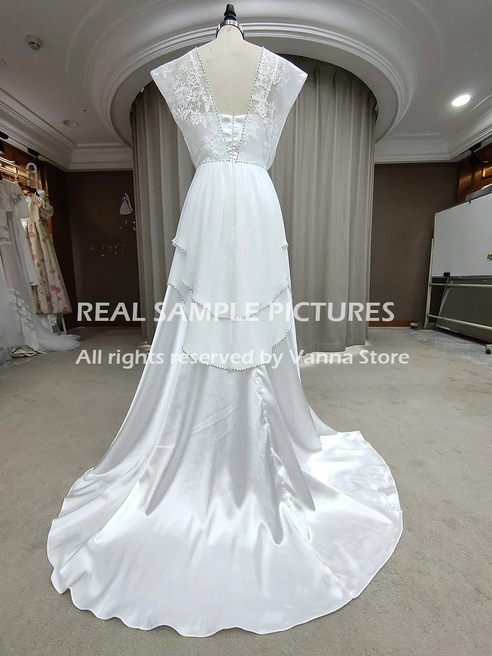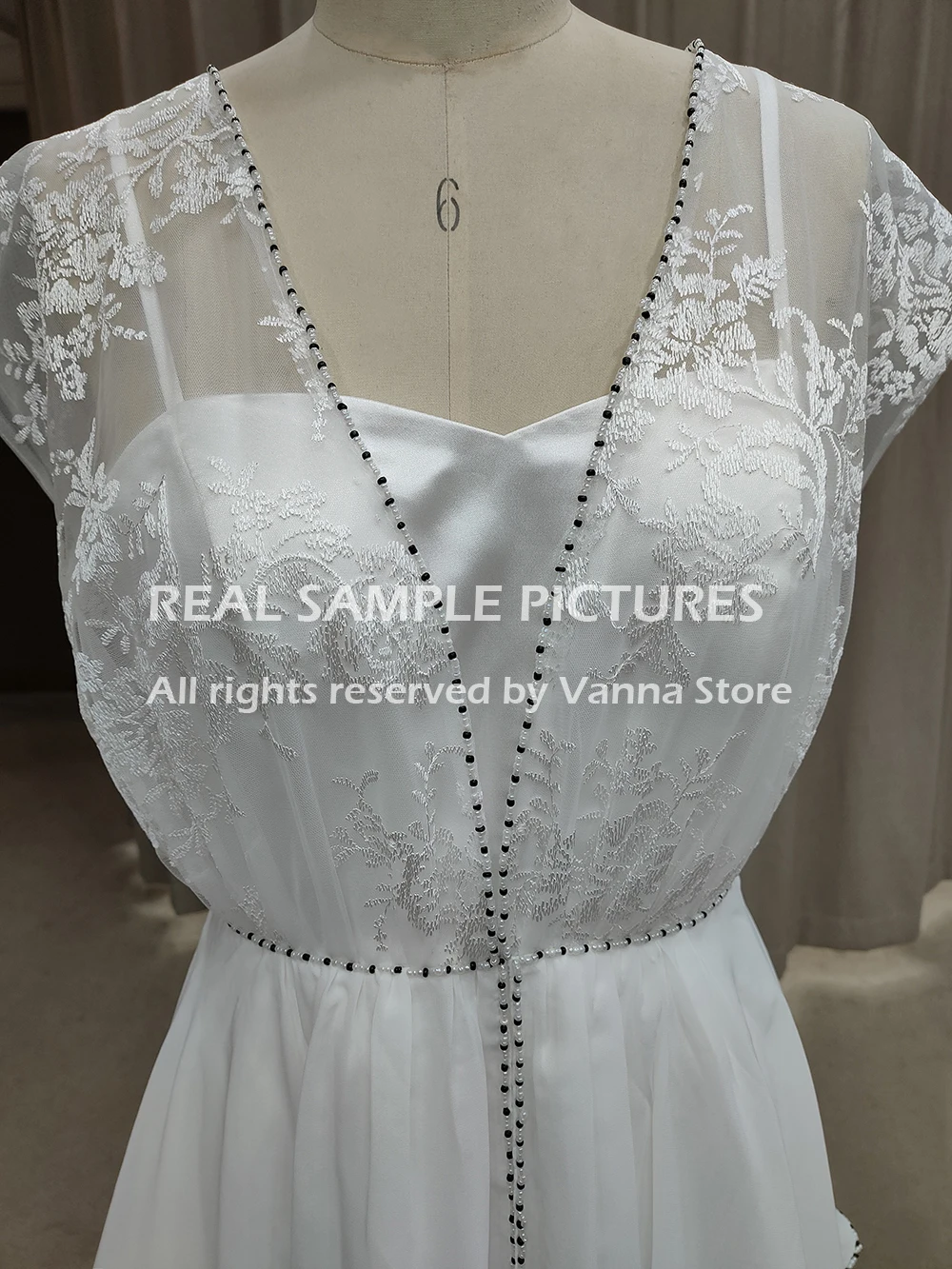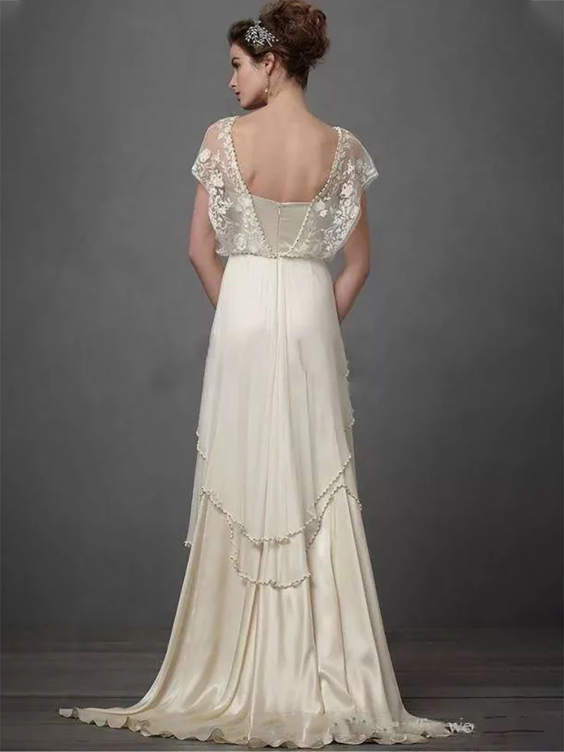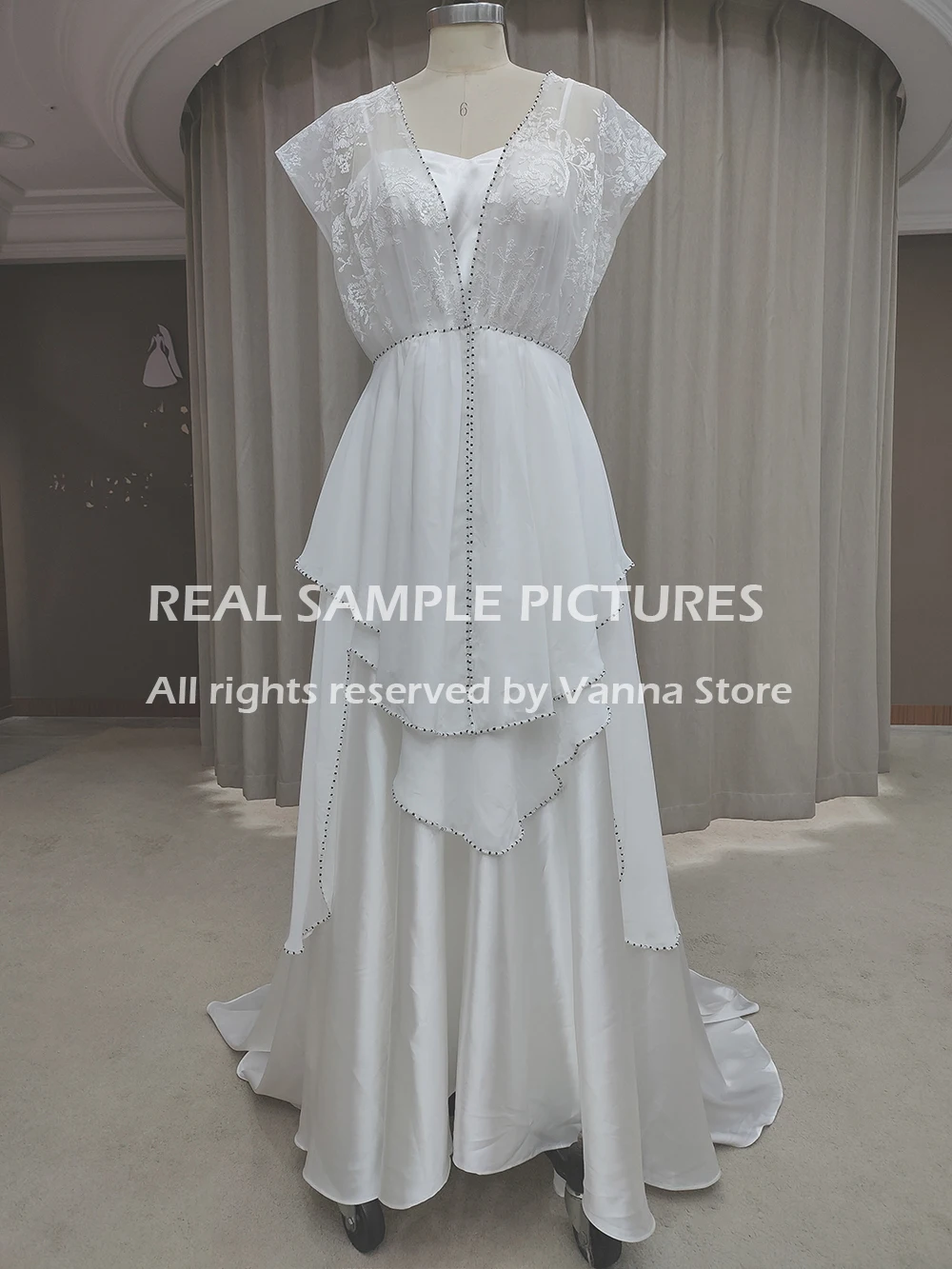 Шифоновое асимметричное атласное кружевное винтажное классическое свадебное платье трапециевидной формы с бисером, модель 9145 #1920s