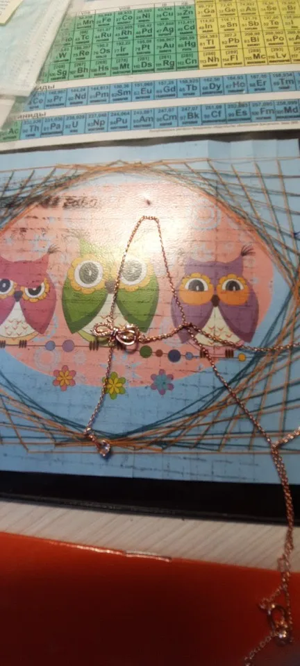 Ожерелье симпатичное, цвет под золото, но есть недостатки при спайке. В самом бантике на хвостике есть следы инструментов при изготовлении, при попадании света очень заметно. Фото это не передаёт. Само изделие интересное, если бы не качество.