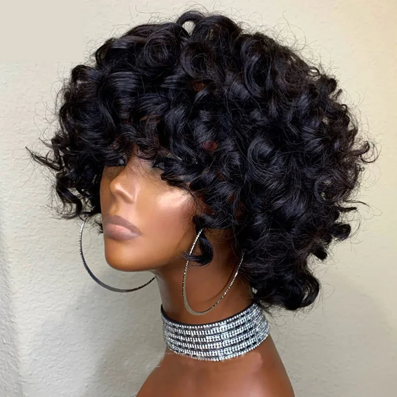 Короткие вьющиеся парики из человеческих волос с челкой, бразильский парик для кожи головы, машинная работа, парик 10 дюймов, 250 Полная плотность, парик черного и коричневого цвета