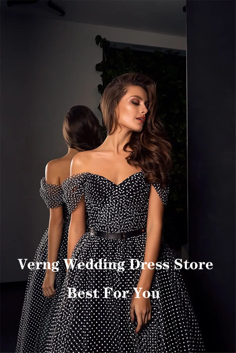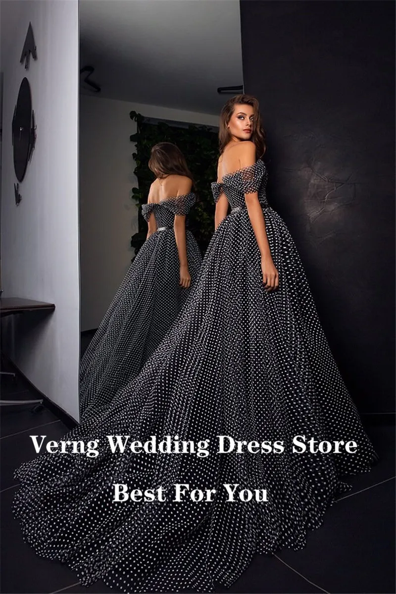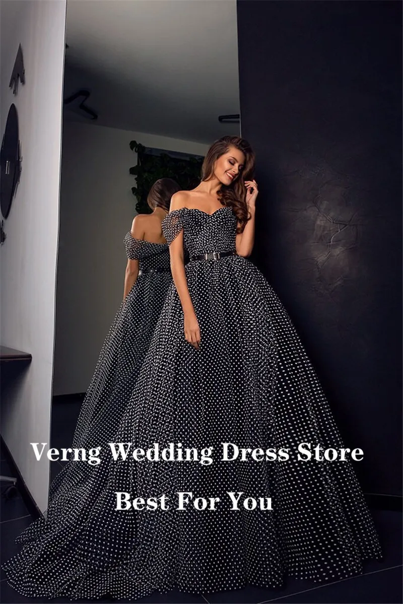 Элегантное ТРАПЕЦИЕВИДНОЕ черное Тюлевое официальное вечернее платье в горошек Verngo с открытыми плечами рукавами в Пол Вечерние платья для выпускного вечера