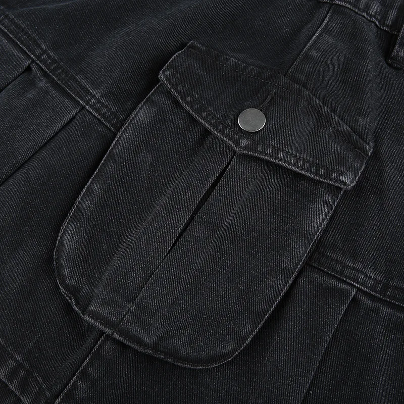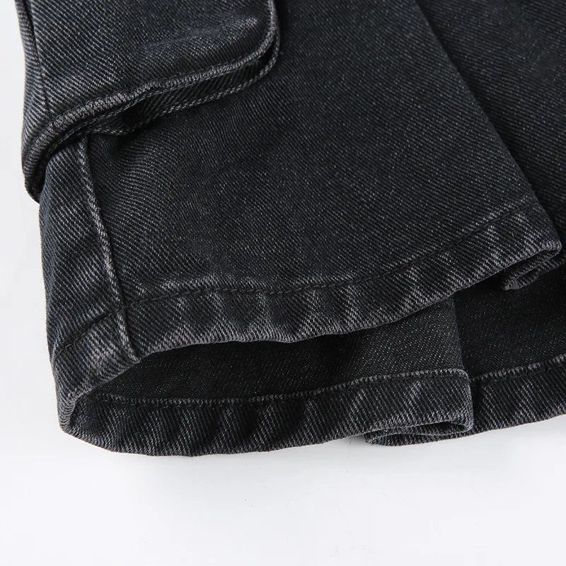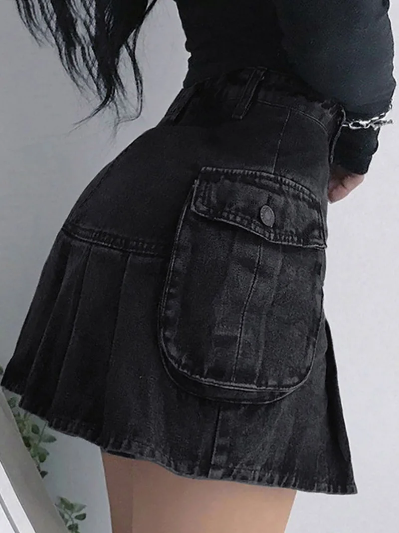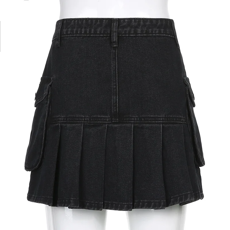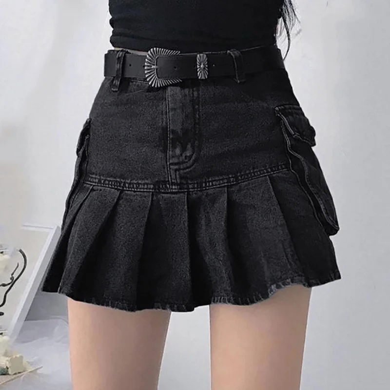 Женские джинсовые юбки с высокой талией Y2K, эстетичные черные джинсовые плиссированные юбки с большими карманами, одежда в готическом стиле, панк, E-girl, темная академия