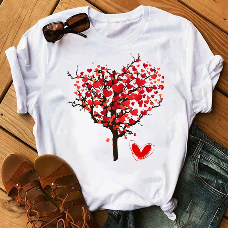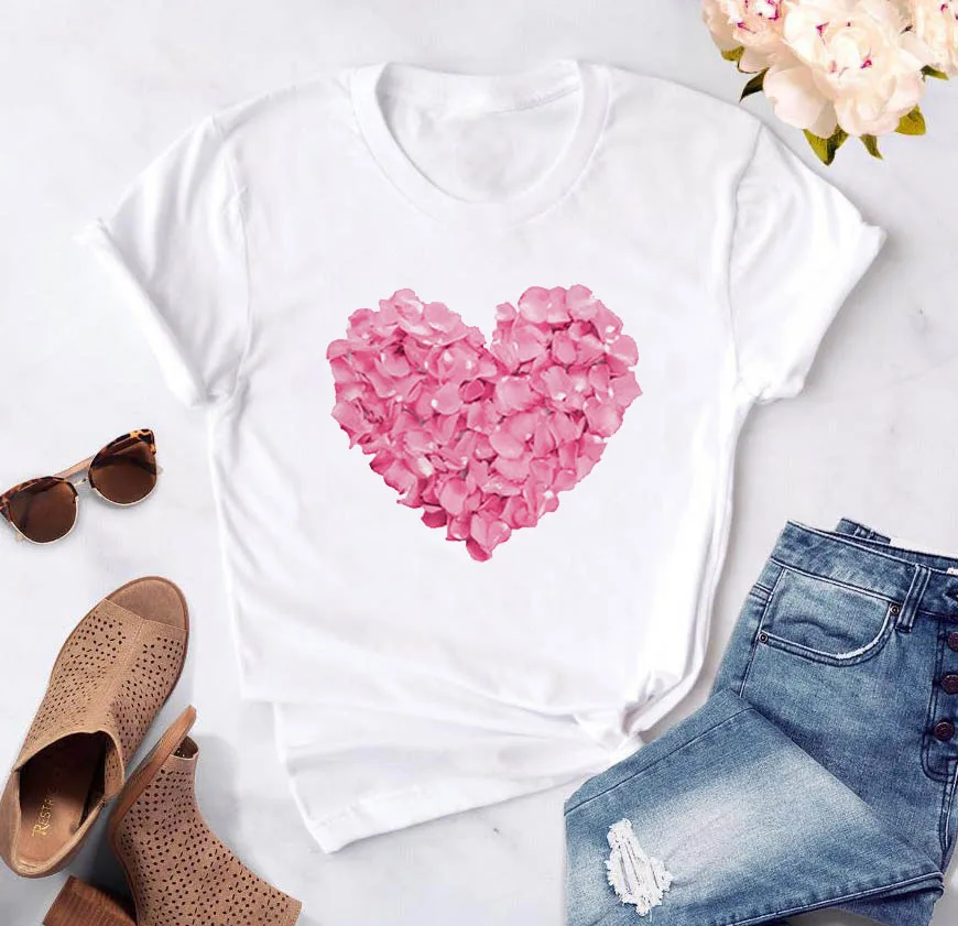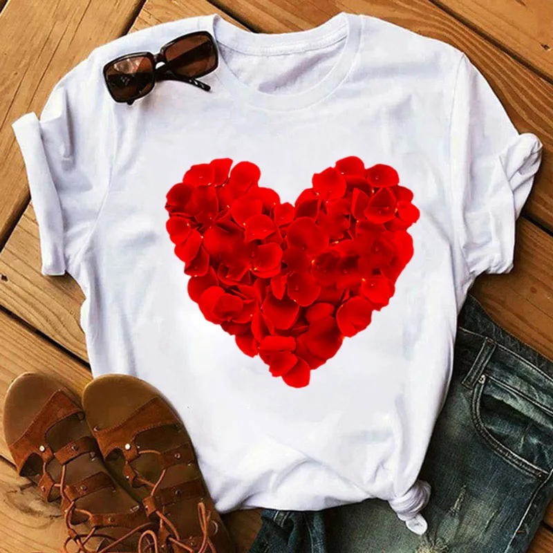 Новая женская футболка с принтом красных роз и сердец, топы с коротким рукавом в стиле Харадзюку, женские летние футболки, модные женские футболки