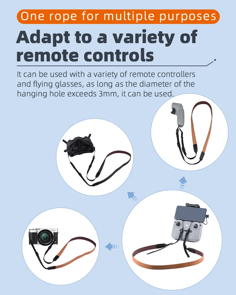 1. Освободите руки и облегчите воздушный полет,2. Ремешок доступен в двух цветах, и подвесная горловина удобна,3. Двойной Крюк кронштейн, прочный и анти-падение,4. Он используется для других пультов дистанционного управления с висящими отверстиями и имеет широкий спектр использования,5. Удобно носить, длинная длина может быть скорректирована до 73 см, а Регулируемая пряжка соответствует привычкам ношения разных людей.