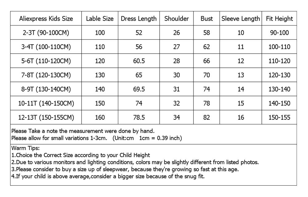Aliexpress Размер От 7 до 8 лет (120-130 см), свободный размер 130, Длина платья: 65 см, ширина плеч: 30 см, обхват груди: 70 см, длина рукава: 13 см, Высота посадки: 120-130 см