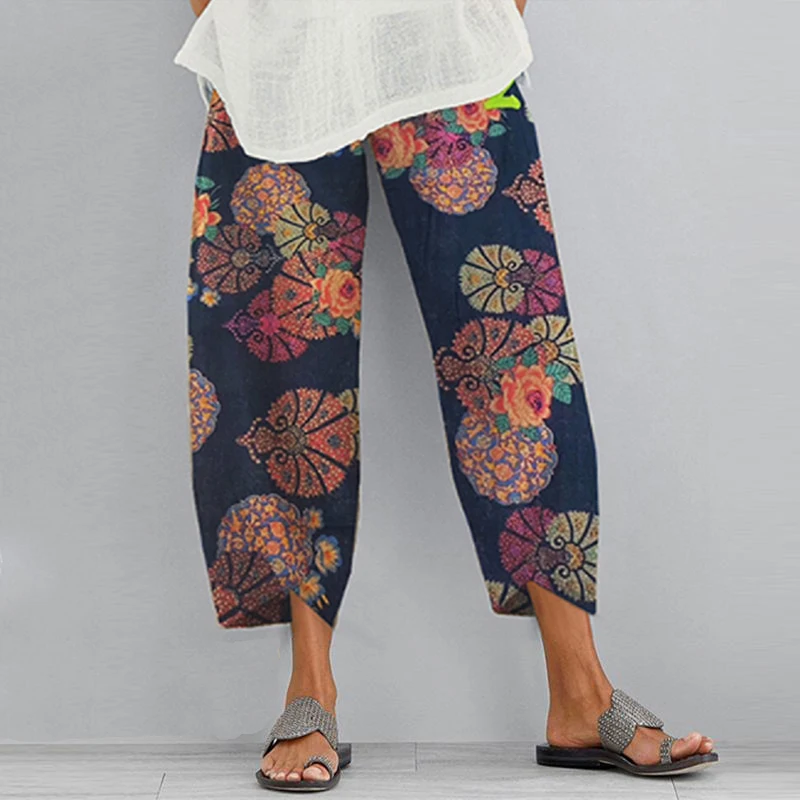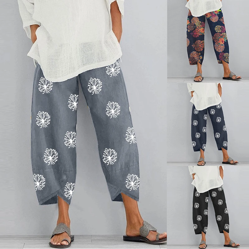 Женские шаровары с цветочным принтом, летние свободные штаны из хлопка и льна с эластичным поясом, размера плюс
